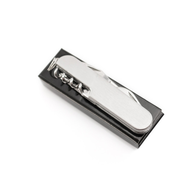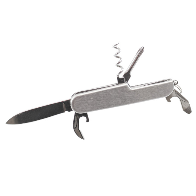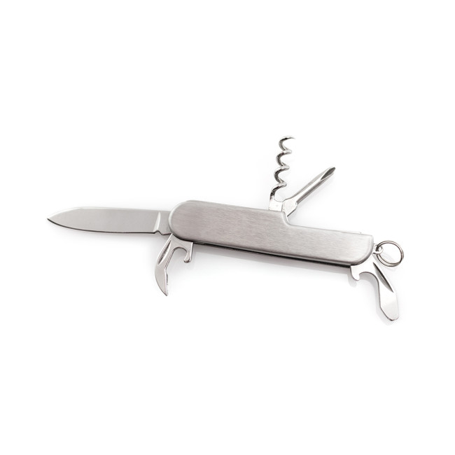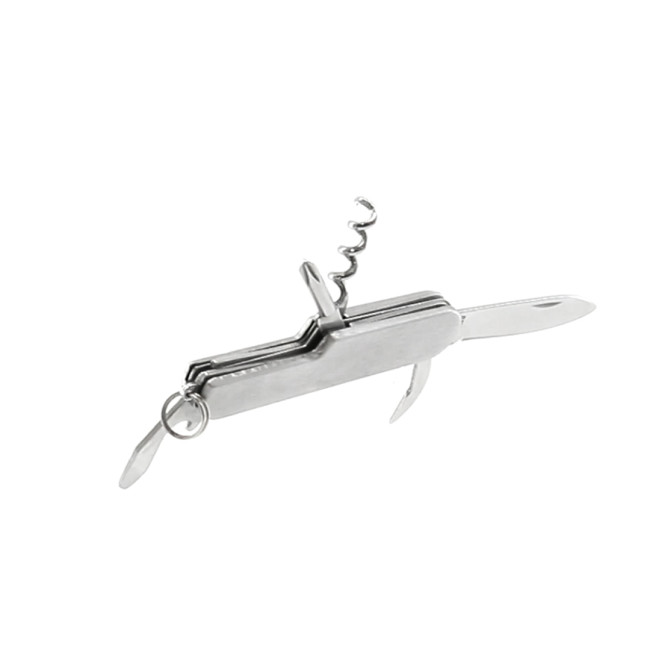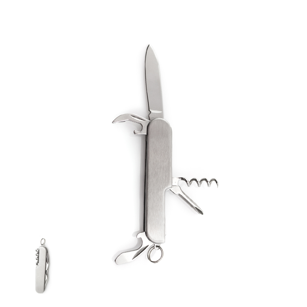 Coltellino multiuso in acciaio inox con 6 funzioni. Include coltello, apriscatole, cacciavite e portachiavi. Presentato singolarmente in una scatola.