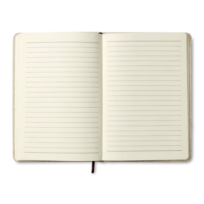 Notebook A5 con copertina rigida in tela. 192 pagine riciclate a righe (96 fogli). Chiusura con elastico a strappo e nastro segnapagina a contrasto.