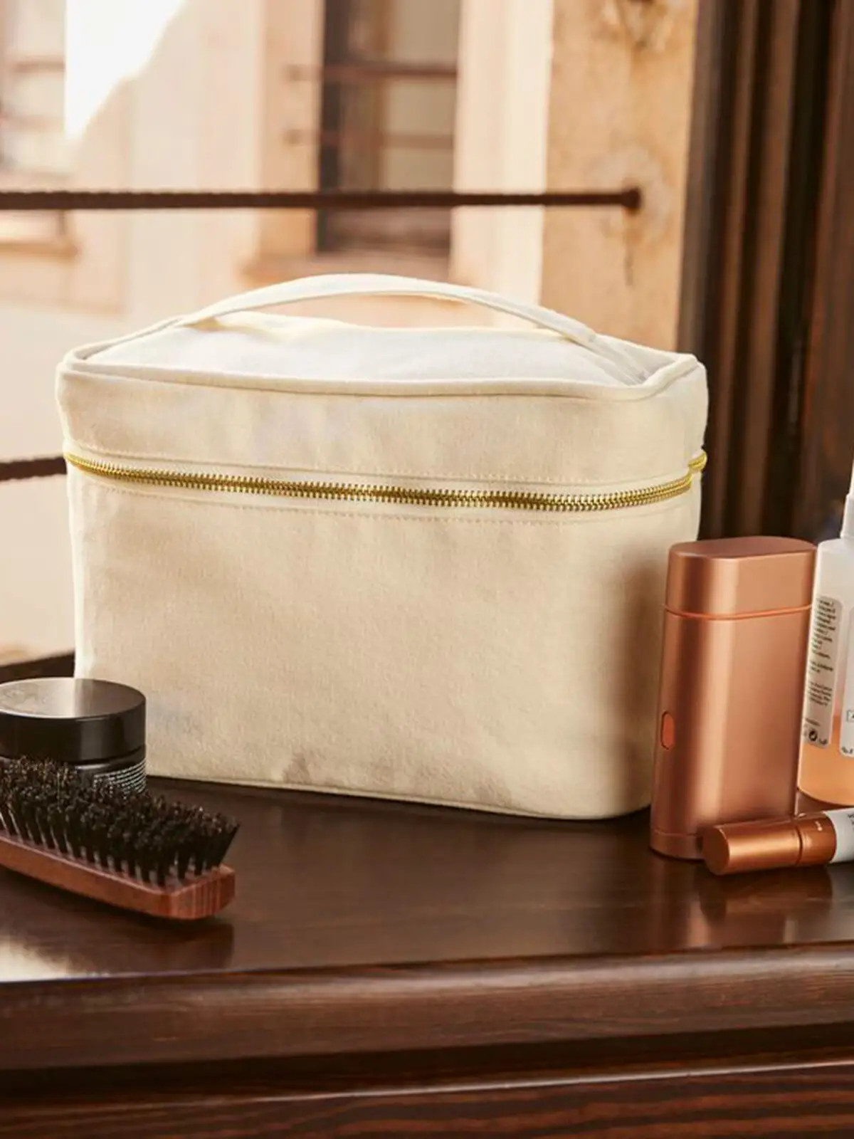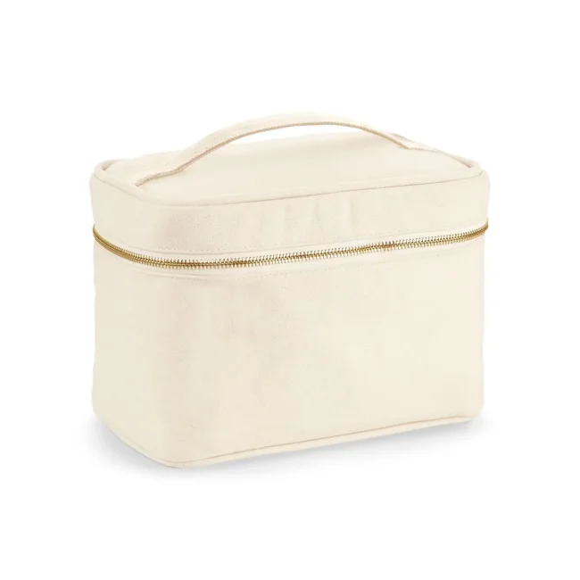 100% cotone Canvas pettinato. Beauty Case multiuso con manico e fodera in cotone, chiusura con zip, dimensioni: 23 x 16 x 14 cm, capacita': 5 litri, area di stampa: 21 x 10 cm. Etichetta removibile.