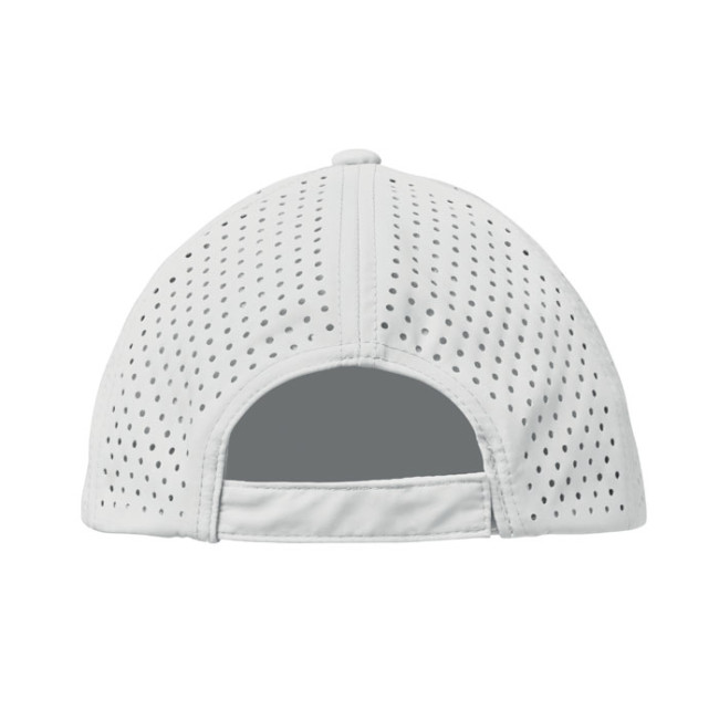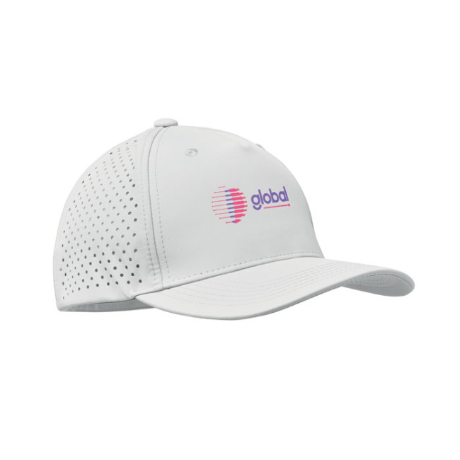 Cappellino a 5 pannelli in poliestere ad alte prestazioni con chiusura a gancio e anello regolabile e fori perforati al laser con 2 occhielli cuciti in tinta. L'articolo è ad asciugatura rapida, repellente al sudore e all'acqua. 130 gr/m².