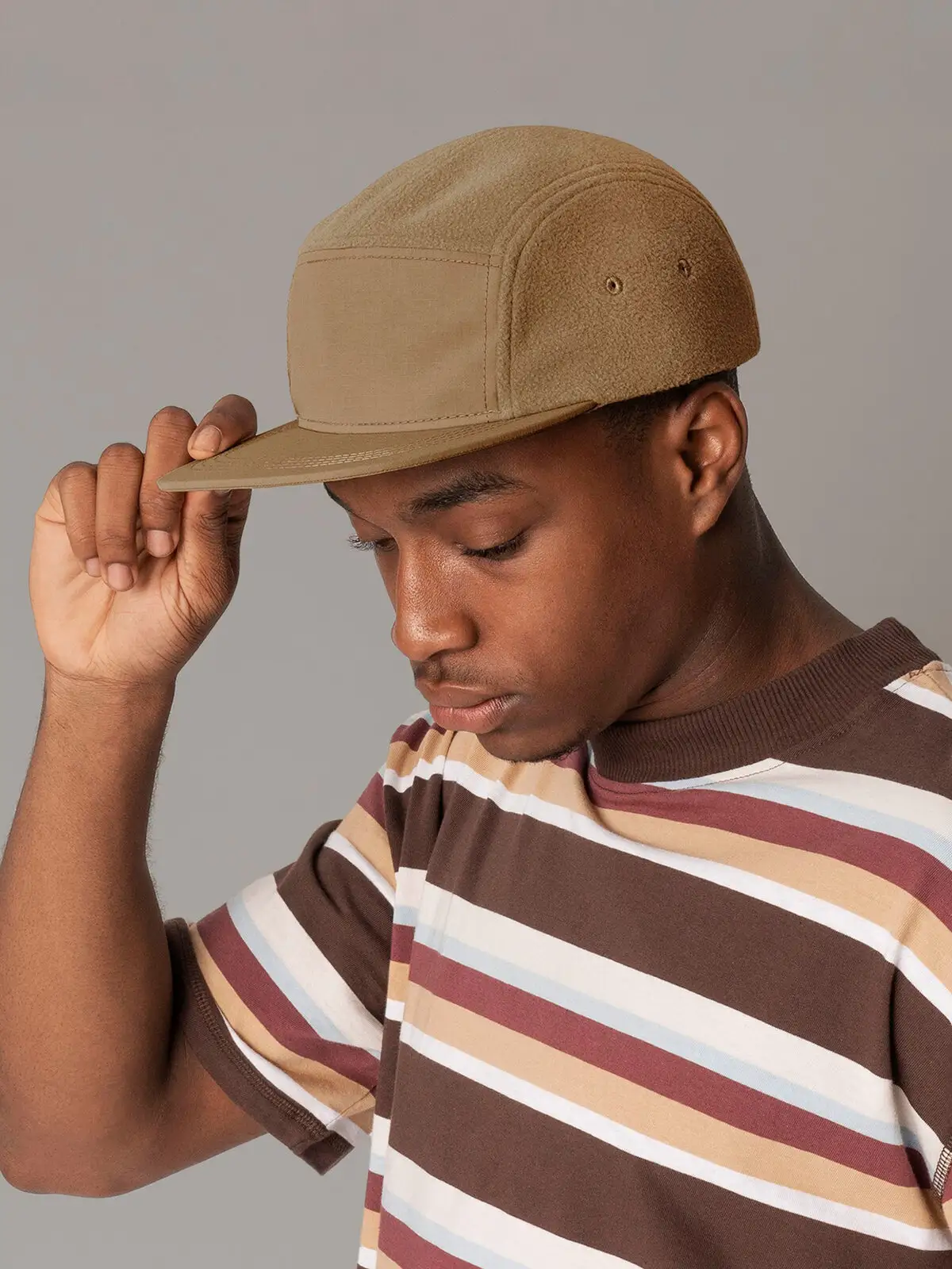 Cappellino a 5 pannelli realizzato in 100% poliestere riciclato, dotato di chiusura con fettuccia e clip. La visiera piatta e gli occhielli di ventilazione cuciti assicurano una buona vestibilità e comfort.