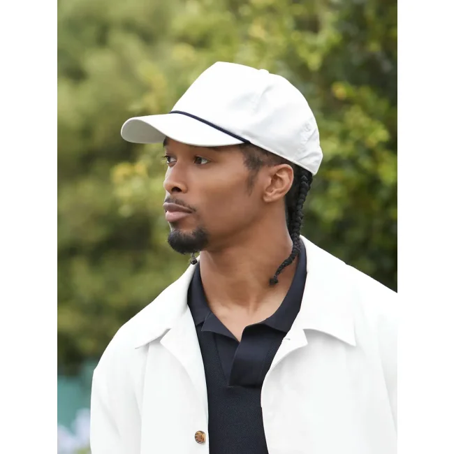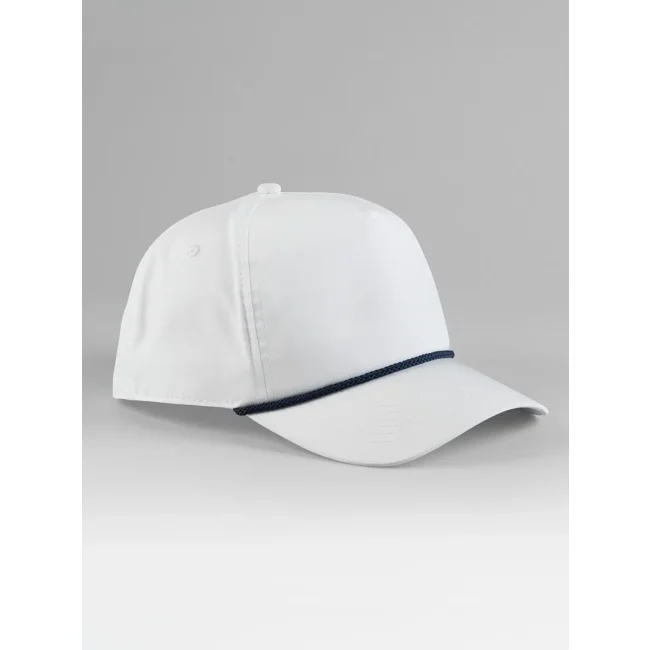 Cappellino a 5 pannelli realizzato in poliestere riciclato, dotato di chiusura regolabile snapback e visiera semicurva con un dettaglio a contrasto in corda. Gli occhielli di ventilazione cuciti garantiscono comfort e traspirabilità.