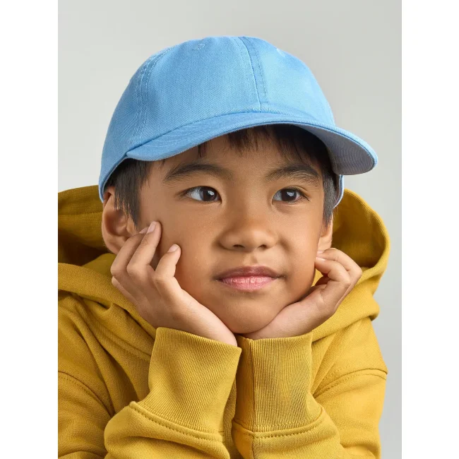Cappellino Kid Fraser in cotone organico certificato, progettato per bambini con 6 pannelli e chiusura a strappo. Presenta un design destrutturato e un'etichetta removibile per un look pratico e comodo.