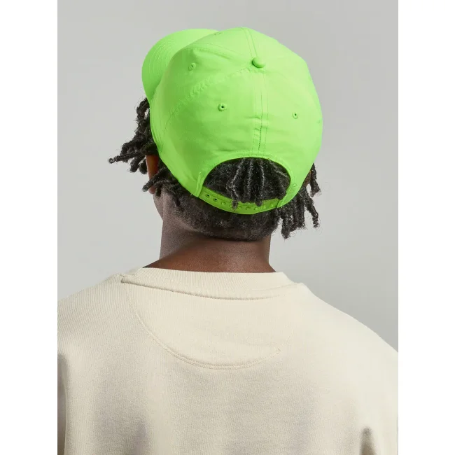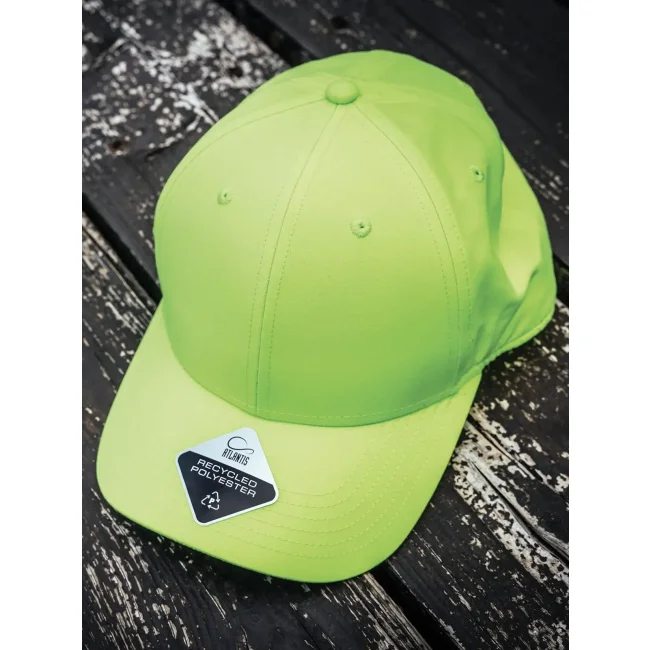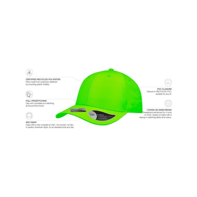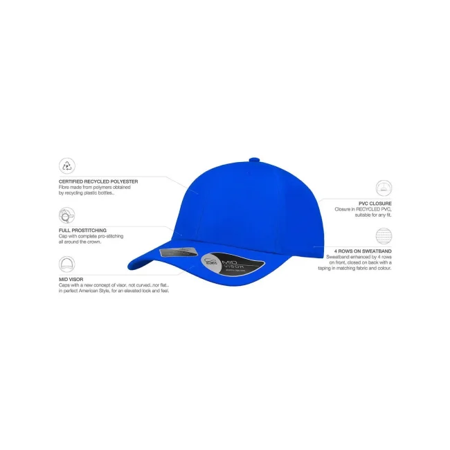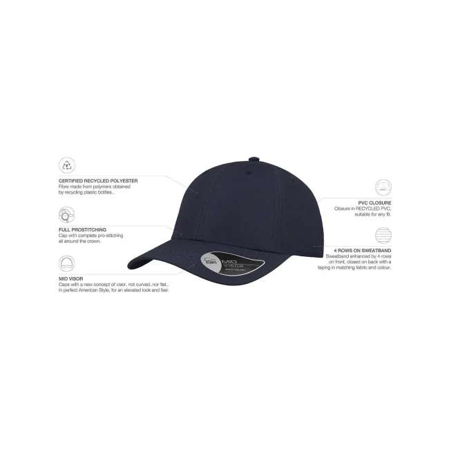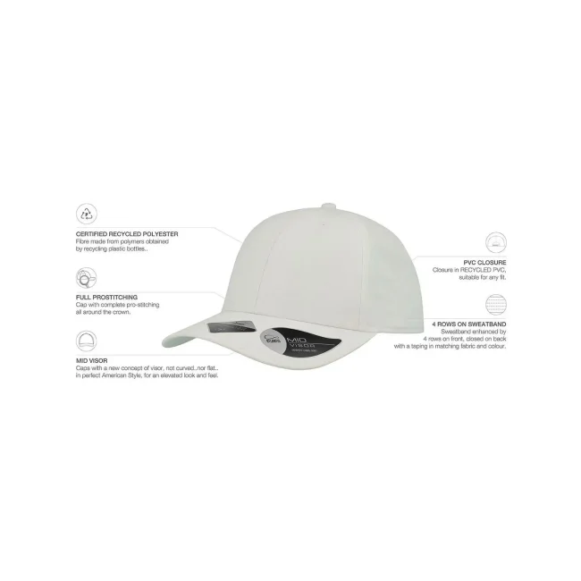 Cappellino a 6 pannelli realizzato in 100% poliestere Twill riciclato. Include una visiera precurvata, occhielli ricamati e 6 cuciture sulla visiera. L'etichetta removibile consente una personalizzazione semplice e veloce.