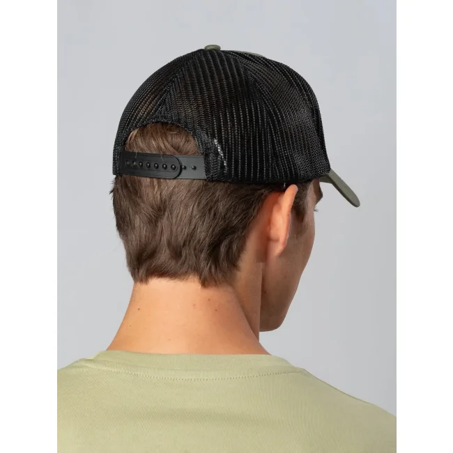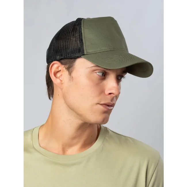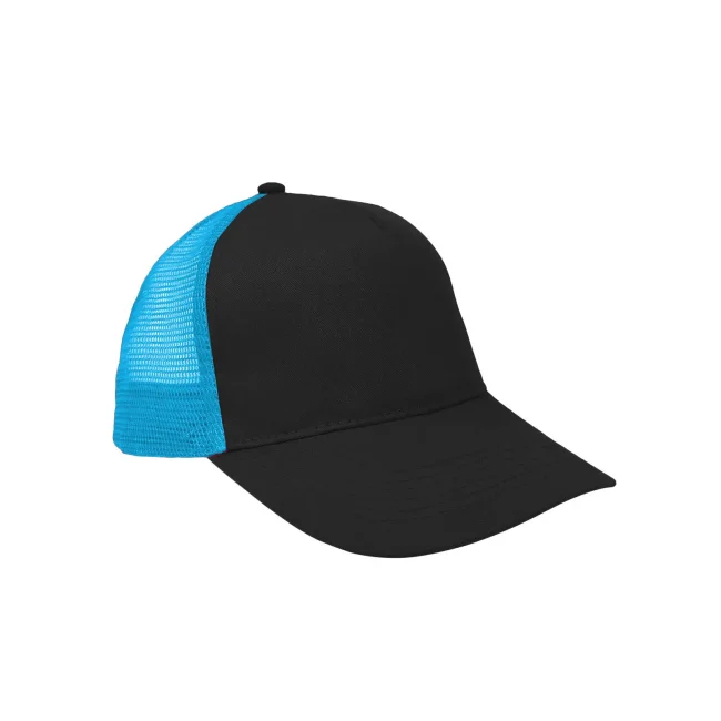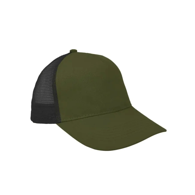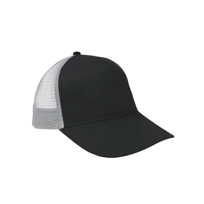 100% cotone. Cappellino a 5 pannelli, mesh posteriore e laterale in poliestere, pannello frontale rinforzato, visiera pre-curvata, chiusura in pvc, ideale per la stampa, 6 cuciture su visiera.