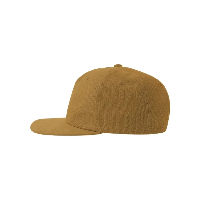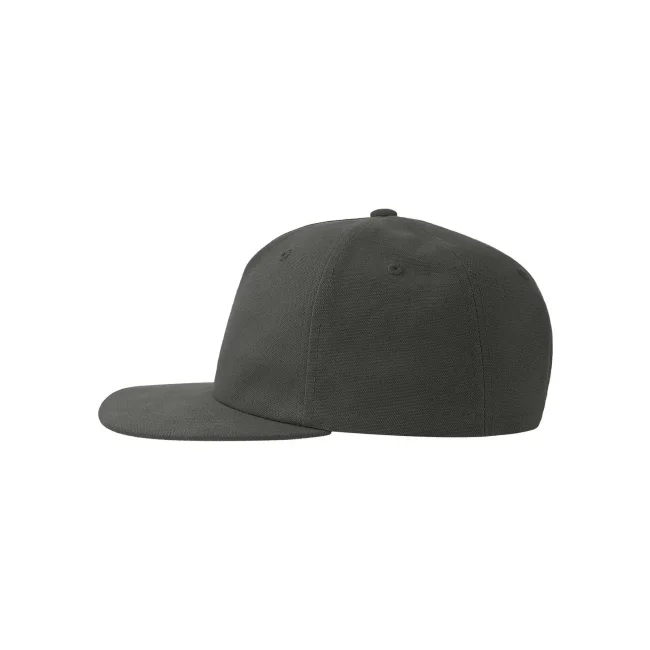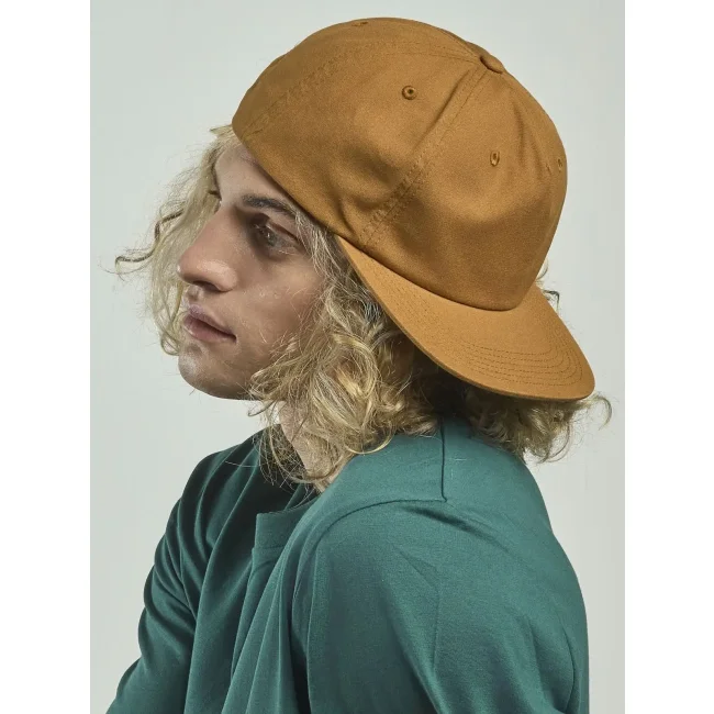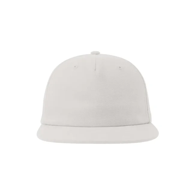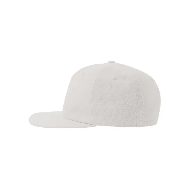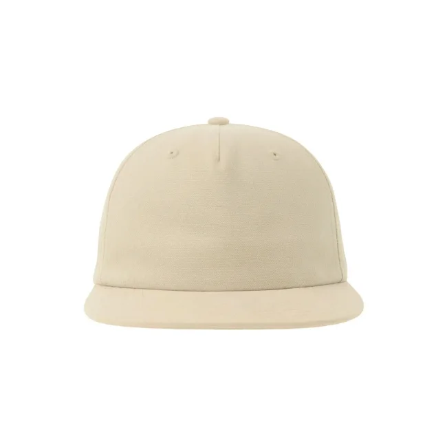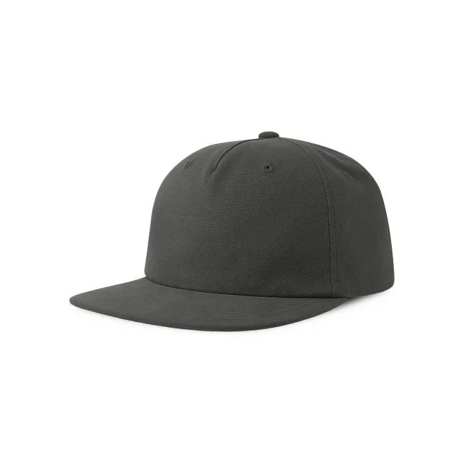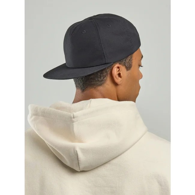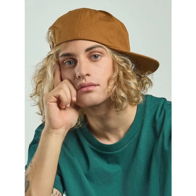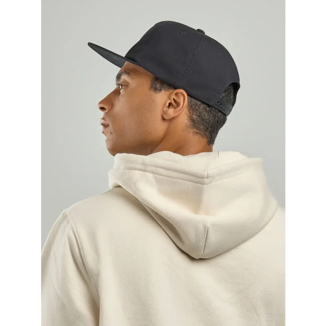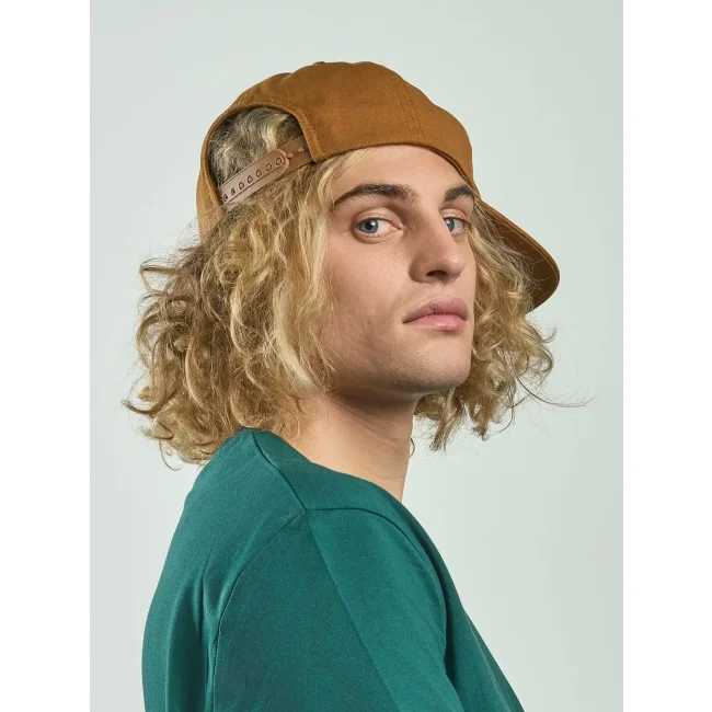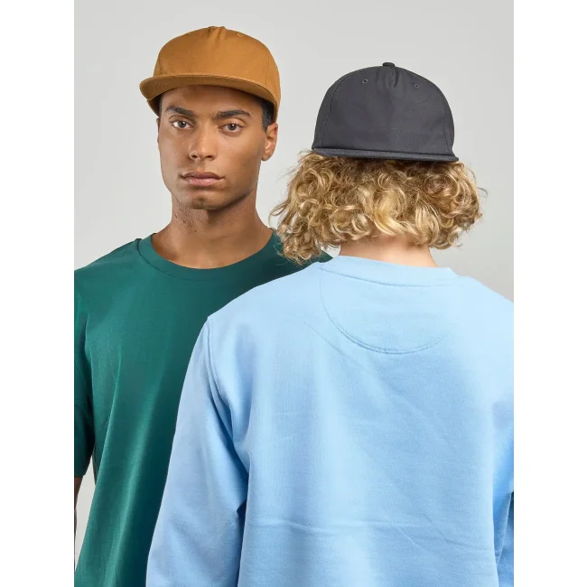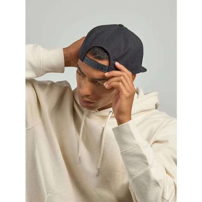Cappello a 5 pannelli realizzato in cotone canvas organico e riciclato, dotato di visiera piatta e chiusura snapback in PVC. Presenta un'etichetta removibile, rendendolo una scelta ecologica.