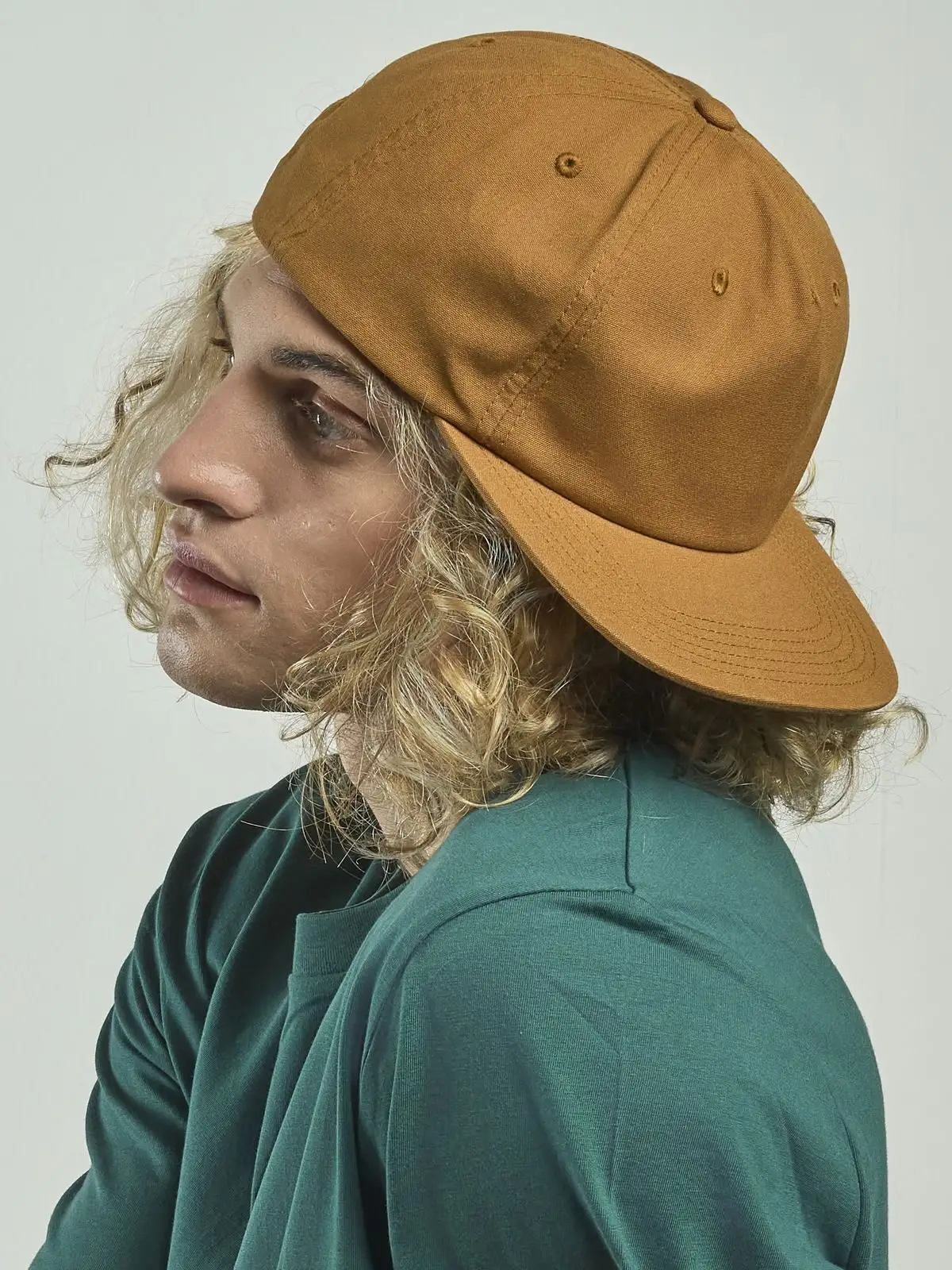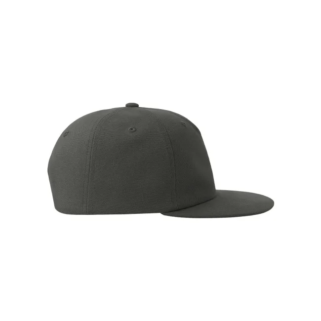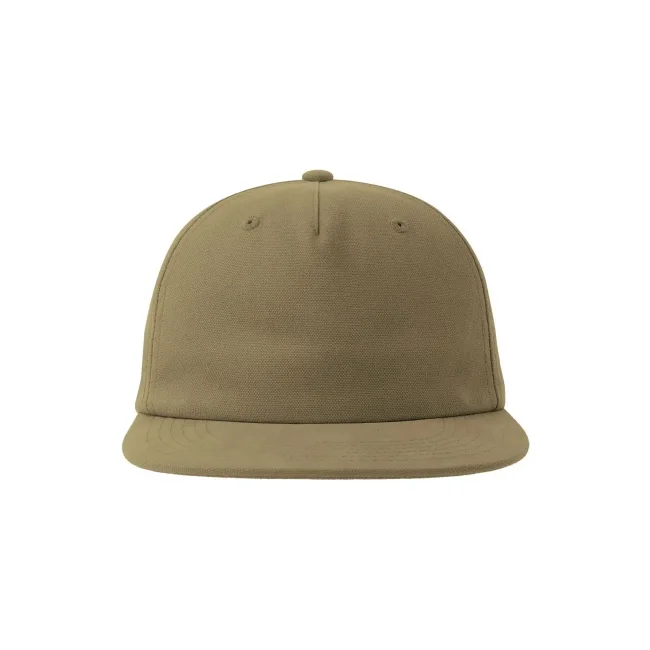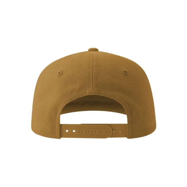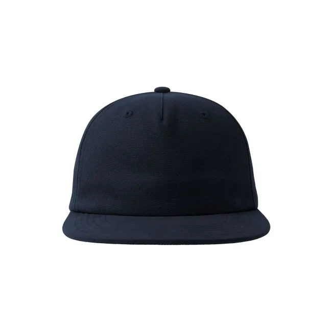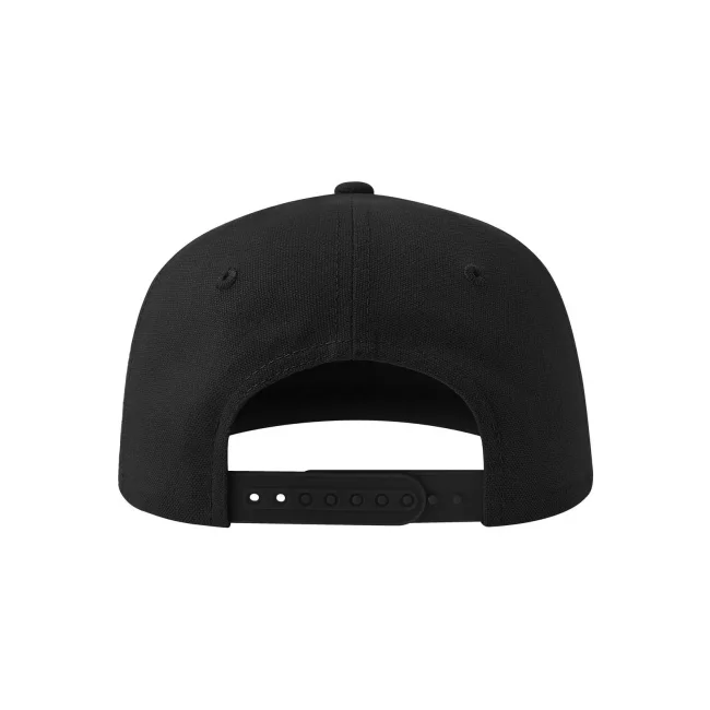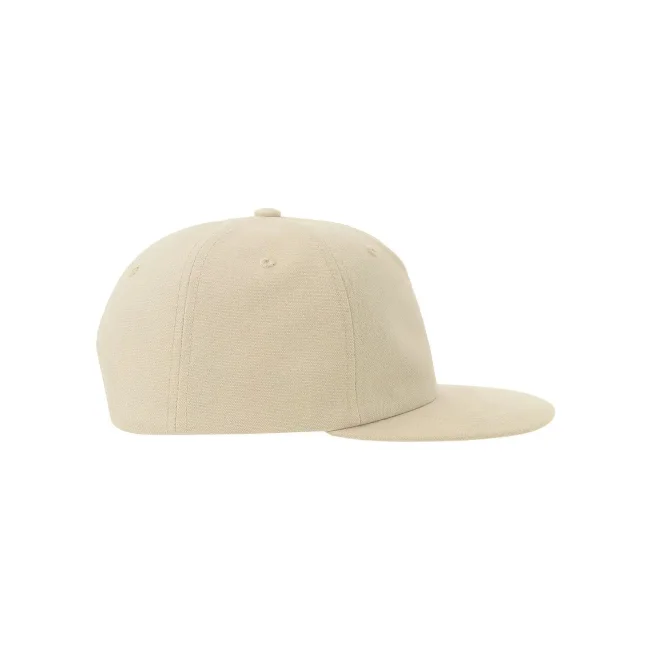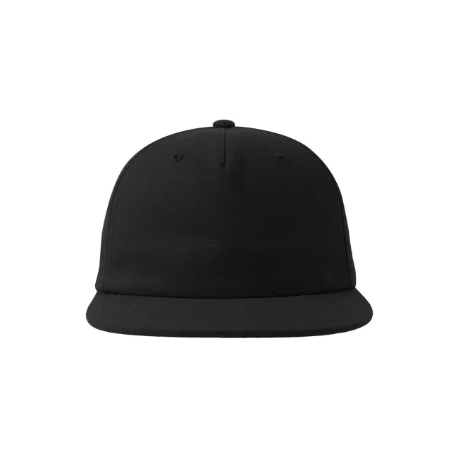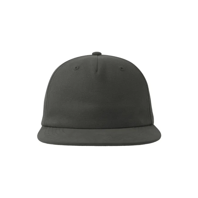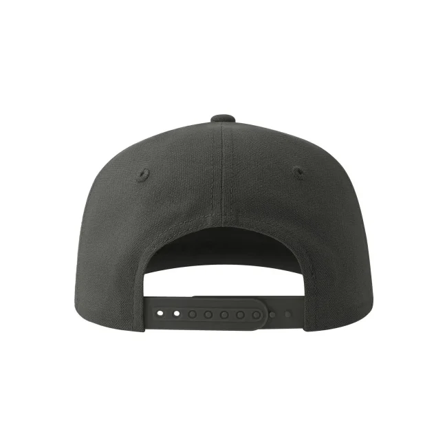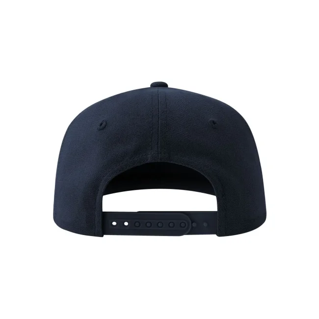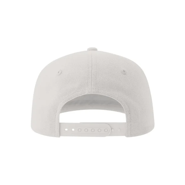 Cappello a 5 pannelli realizzato in cotone canvas organico e riciclato, dotato di visiera piatta e chiusura snapback in PVC. Presenta un'etichetta removibile, rendendolo una scelta ecologica.