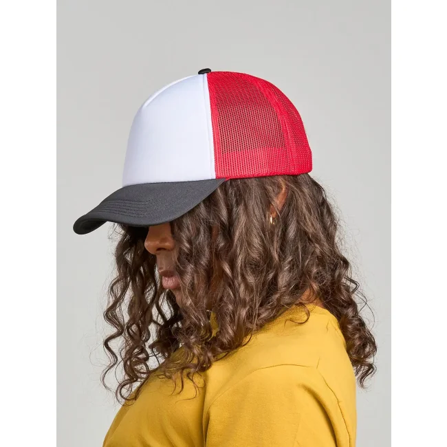 Cappello a 5 pannelli realizzato in 100% poliestere riciclato, dotato di pannello frontale imbottito per maggiore comfort e chiusura snap-back. I pannelli laterali e posteriori in mesh garantiscono traspirabilità, rendendolo un accessorio pratico e sostenibile.