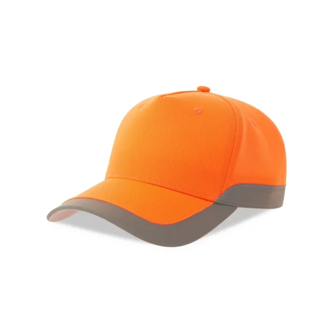 Cappello Helpy-S realizzato in 100% poliestere riciclato, progettato per garantire alta visibilità e resistenza all'acqua. Dotato di protezione UV 50+, presenta una chiusura a strappo e dettagli grigi in contrasto con i pannelli fluo. Un accessorio ideale per chi cerca sicurezza e sostenibilità.