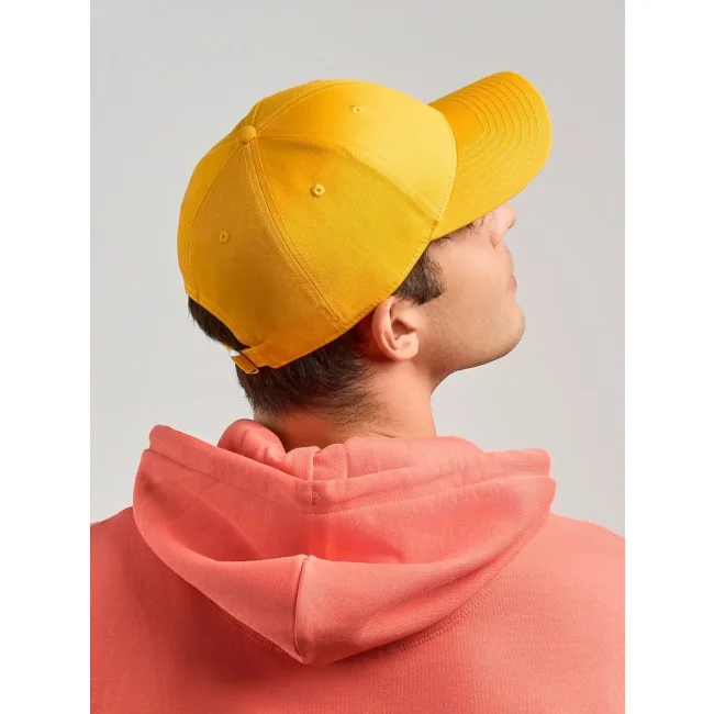 Cappello Hit-S composto da 80% cotone organico e 20% cotone riciclato, presenta un design a 6 pannelli in cotone twill ecosostenibile. La chiusura in fibbia di metallo e l'interno della visiera in plastica riciclata completano il prodotto, rendendolo una scelta responsabile e alla moda.