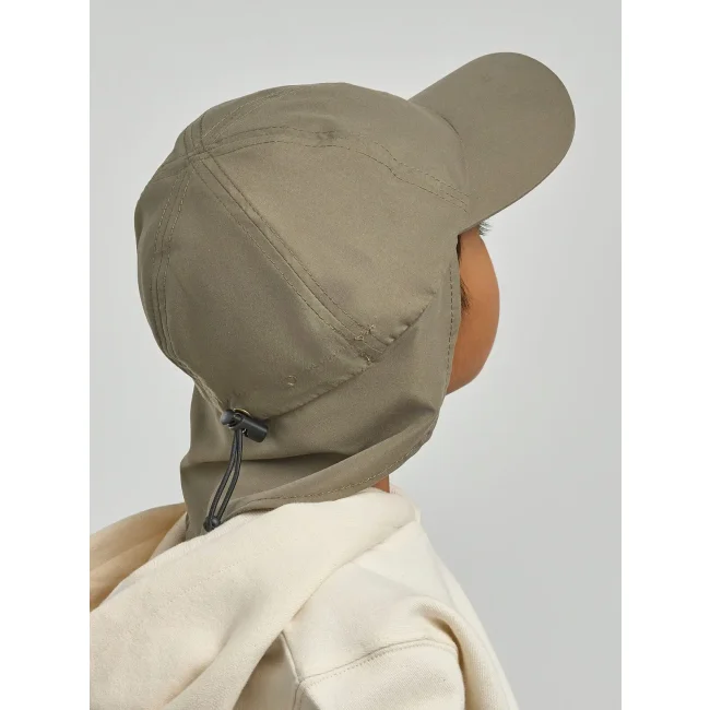 Cappello Kid Nomad-S realizzato in poliestere riciclato, progettato per attività outdoor. Dotato di protezione UV, visiera curva e parasole al collo con chiusura regolabile. Etichetta removibile per un utilizzo pratico.