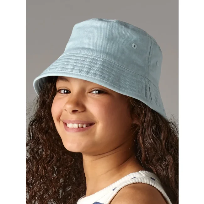 Cappello pescatore per bambini realizzato in 100% cotone twill organico, con fodera in poliestere misto cotone. Garantisce protezione solare UPF 50+ e presenta occhielli di ventilazione cuciti. Disponibile in due taglie: S/M (3-6 anni) e M/L (7-12 anni) con etichetta removibile per un facile rebranding.