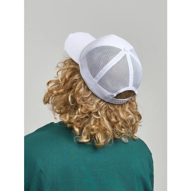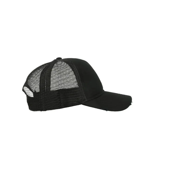 Il cappello Rapper Destroyed è realizzato in cotone al 100% e presenta un design a 5 pannelli con mesh posteriore e laterale. La visiera pre-curvata e il pannello frontale non strutturato lo rendono ideale per la stampa. Con parasudore in cotone e etichetta removibile.