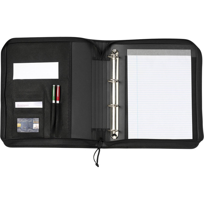 Cartella Office, portablocco formato +/- A4, con meccanismo a 4 anelli, sezione portadocumenti, chiusura lampo, scomparti per penna (non incluse), blocco incluso, in poliestere 600 D
