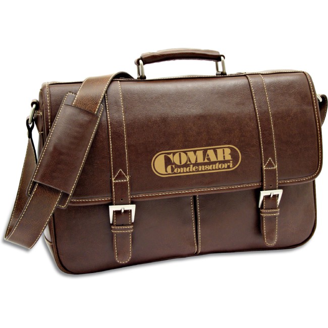 Cartella portadocumenti "RKS" in morbido materiale di colore marrone scuro, tracolla e proteggi spalla, manico, 2 comode tasche frontali, tasca posteriore, 2 vani interni portaoggetti. Confezione in polybag.