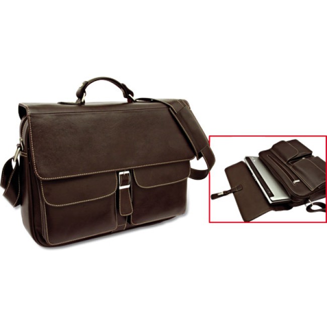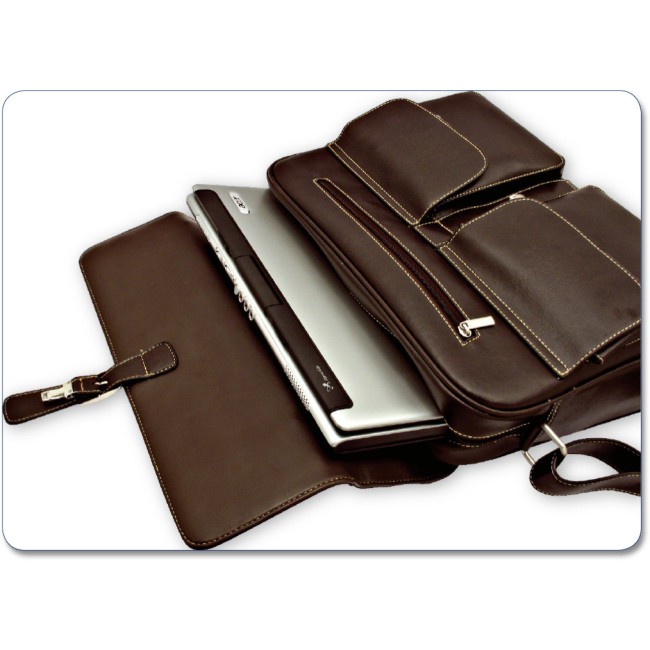 Borsa portacomputer "RKS" in morbido materiale di colore marrone scuro, tracolla e proteggi spalla, manico, 2 comode tasche frontali, tasca posteriore con chiusura con calamita, 2 vani interni portaoggetti. Confezione in polybag.