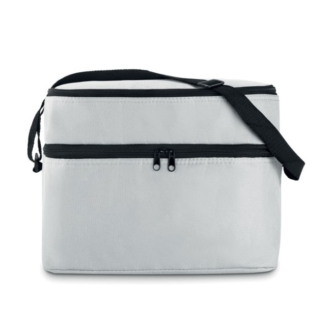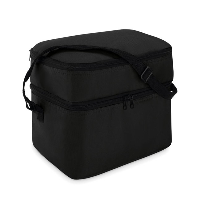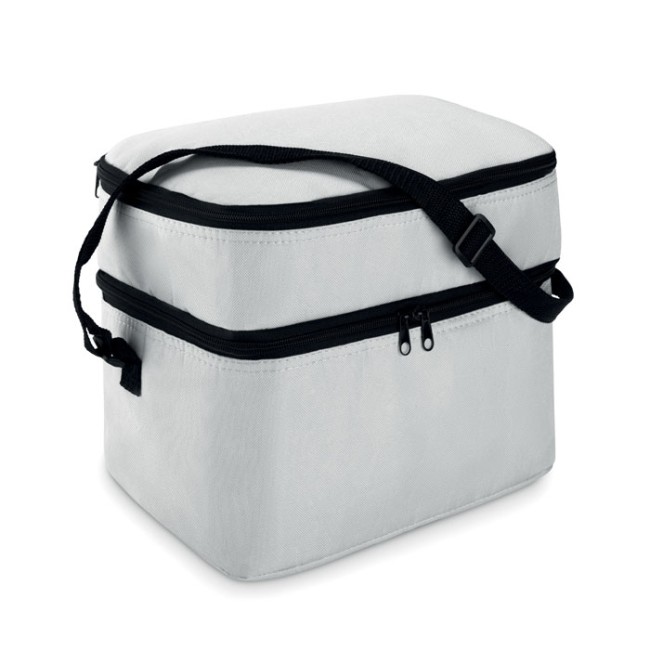 Borsa frigo con due comparti, uno refrigerante (piccolo) e uno termico (grande). Chiusura a zip, tracolla regolabile.