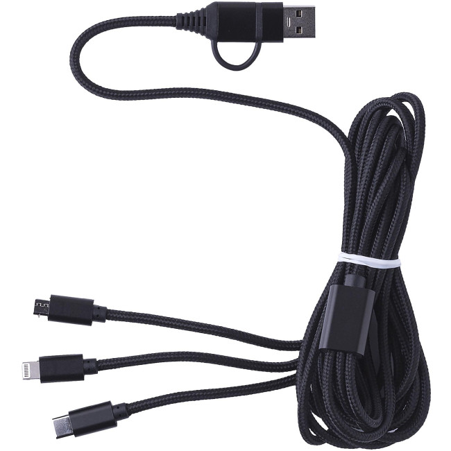 Cavo per la ricarica in nylon, velocià per la ricarcia 1.5 A, comprende connettori A+C, micro, tipo C e lightning, lunghezza del cavo circa 290 cm