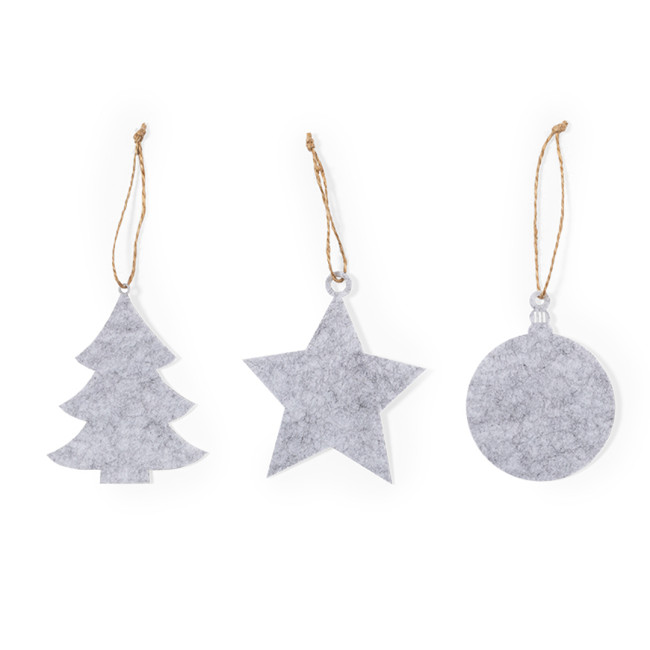 Set di 3 decorazioni natalizie in morbido feltro. Include 3 modelli: albero di Natale, stella di Natale e palla di Natale. Tutti i pezzi includono una gancio per appenderli. Presentato in un sacchetto di carta riciclata.