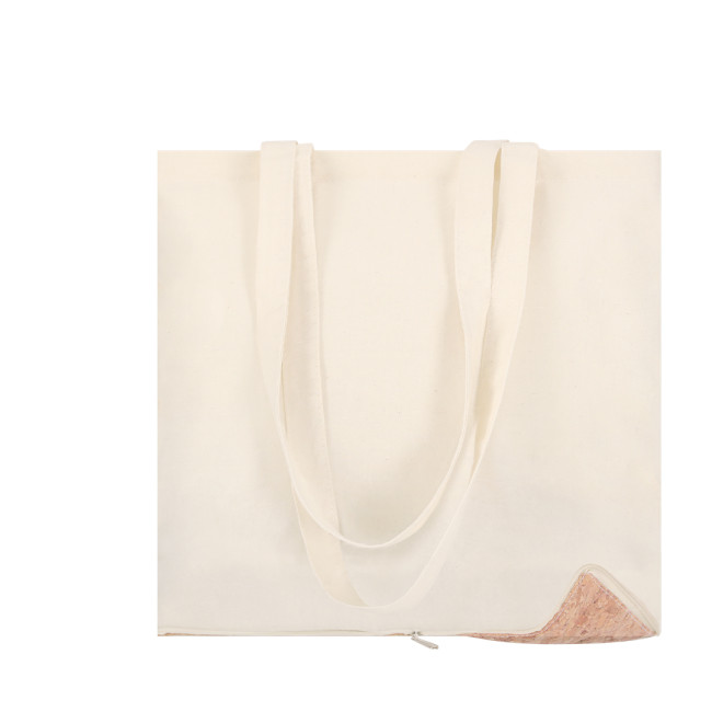 Borsa pieghevole della linea natura, cotone da 110 g/m2 e base in sughero naturale, provvista di tasca. Manici da 57 cm con rinforzo, finitura cucita e resistenza fino a 8 kg di peso. Ripiegabile in ridotte dimensioni con chiusura a cerniera per un facile trasporto