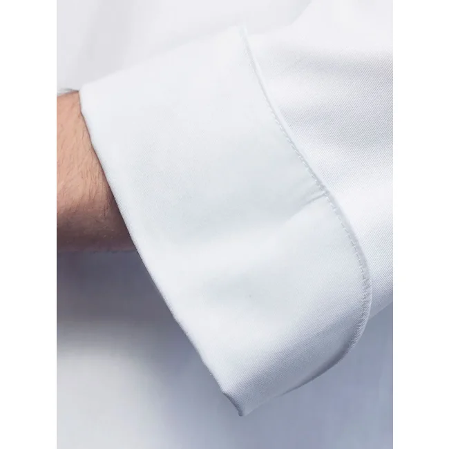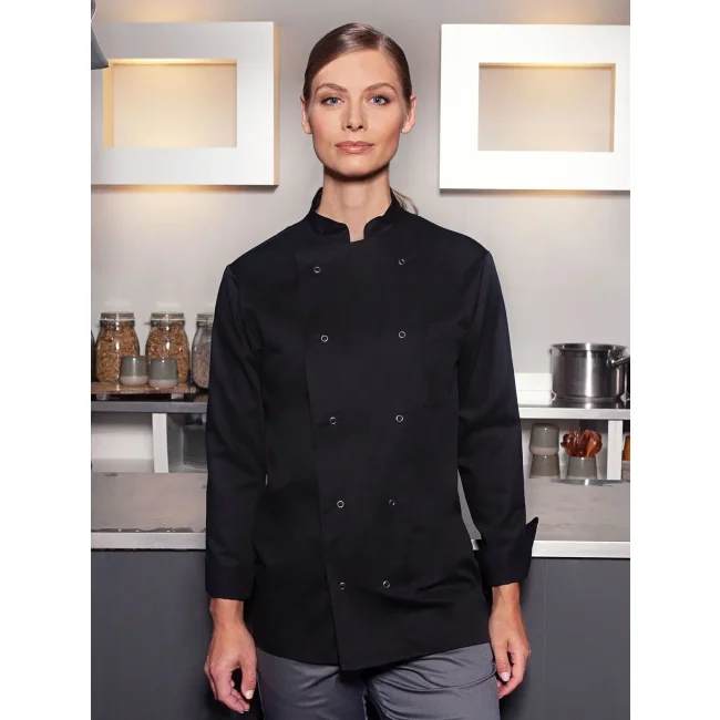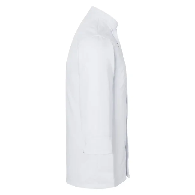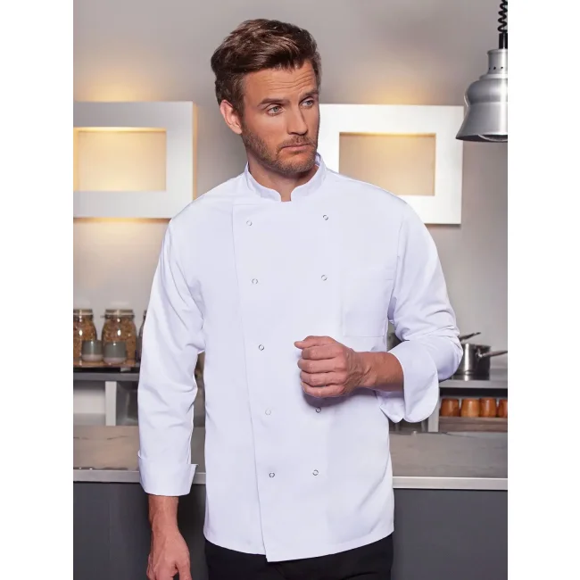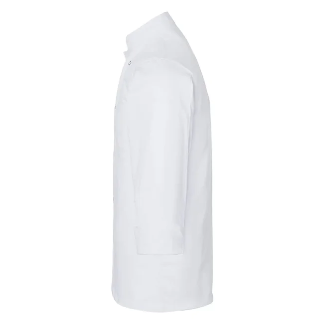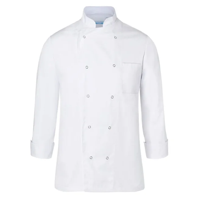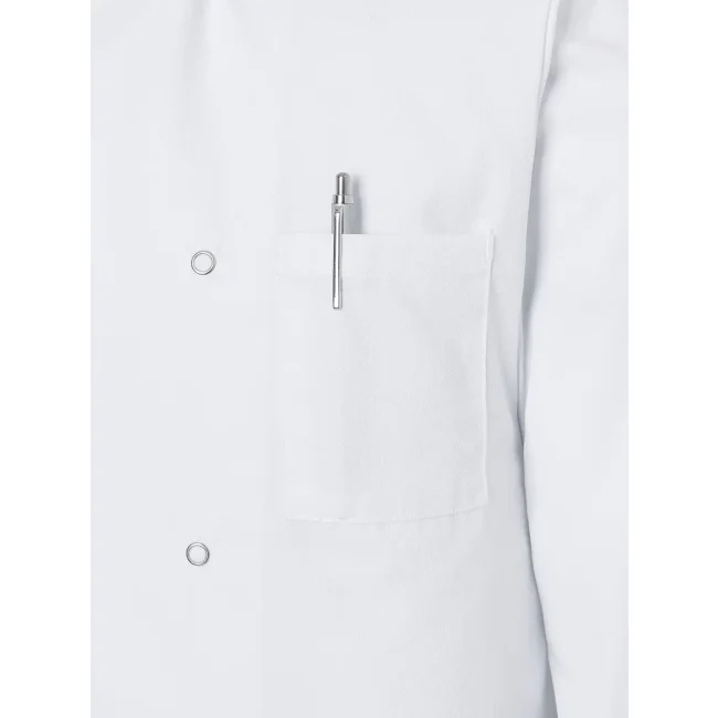 65% poliestere, 35% cotone. Giacca da Chef basic con taglio regolare, taschino al petto, dieci bottoni a pressione. Lavabile a 60°C.
