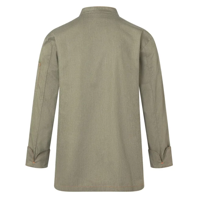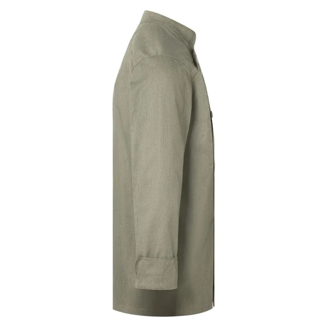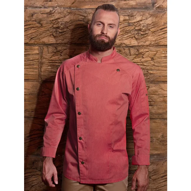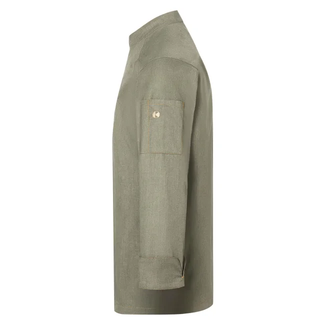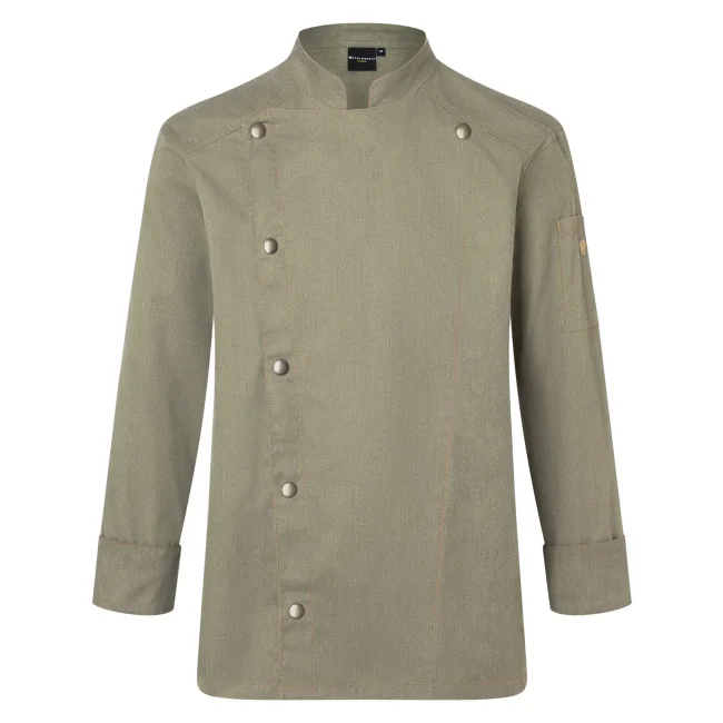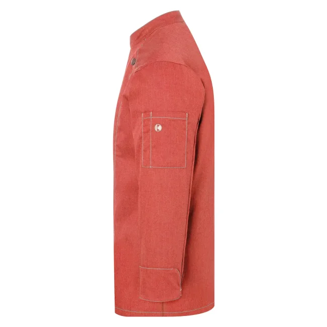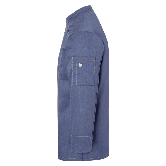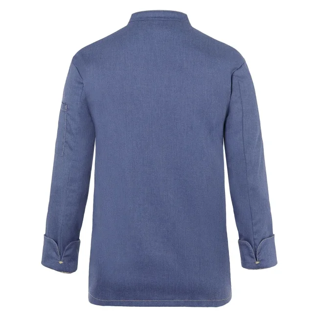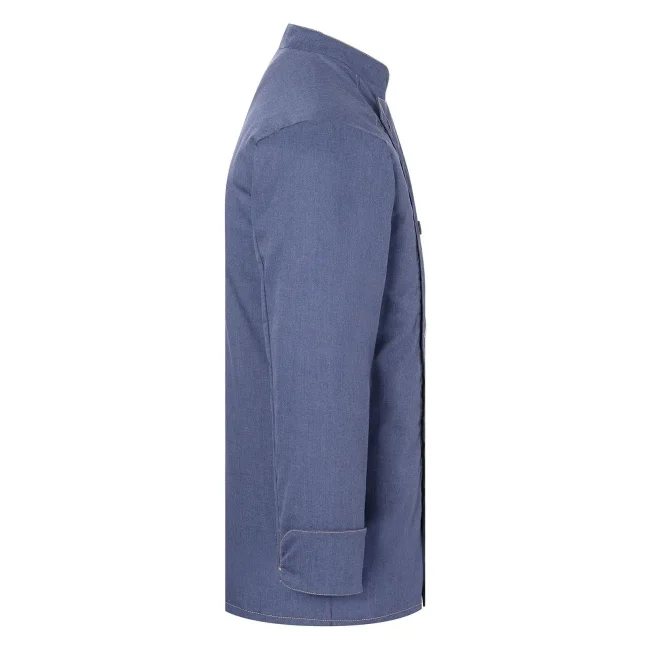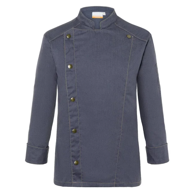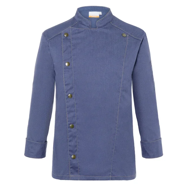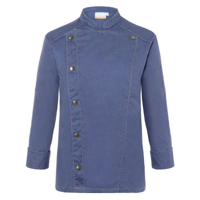 65% poliestere, 35% cotone. Giacca da cuoco di tendenza in stile jeans, tessuto rifinito, irrestringibile, lavabile, indumento pratico, dalla silhouette slanciata, impunture con filato in contrasto conferiscono un jeans look originale, chiusura asimmetrica dotata di un'unica fila di 5 bottoni a pressione per una rapida apertura e chiusura, polsini delle maniche con spacco laterale, tasca applicata sulla manica sinistra con pratico scomparto portapenne, adatto per lavaggi industriali. Lavaggio a 60°C.