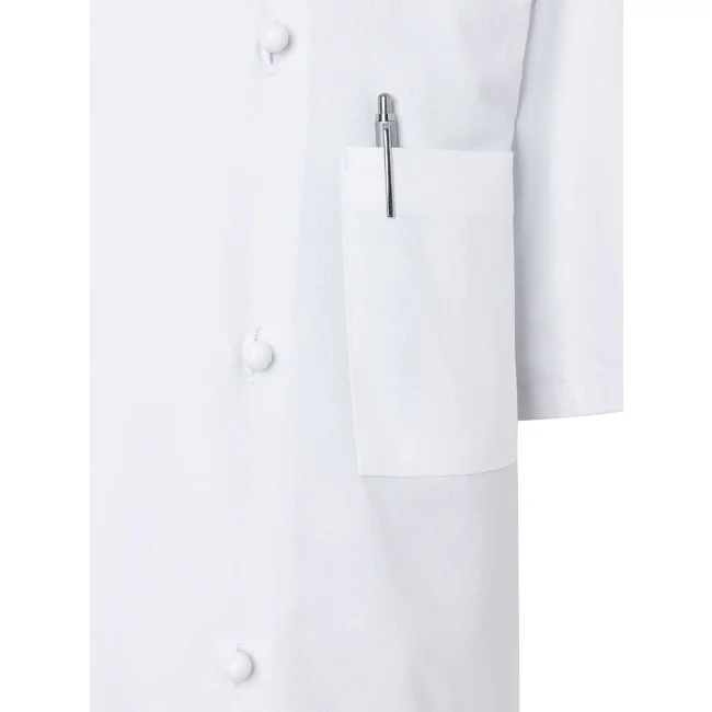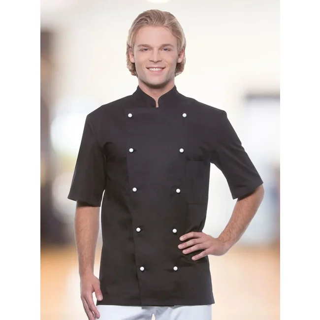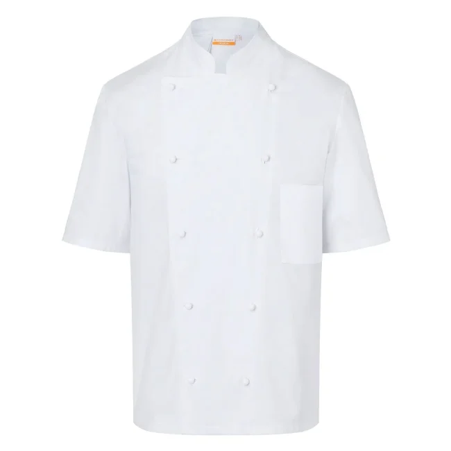 100% cotone. Giacca da Cuoco Lennert, 210 g/m², tessuto altamente rifinito, irrestringibile, non stinge. Giacca da cuoco vestibilità regolare a doppio petto a 10 bottoni, cuciture sul retro, maniche corte, tasca sul petto a sinistra. Da comprare separatamente striscia articolo KKL4 + bottoni disponibili in diversi colori (vedi articoli correlati). Adatta per lavaggio industriale a 95°C. Taglie 44 - 66.