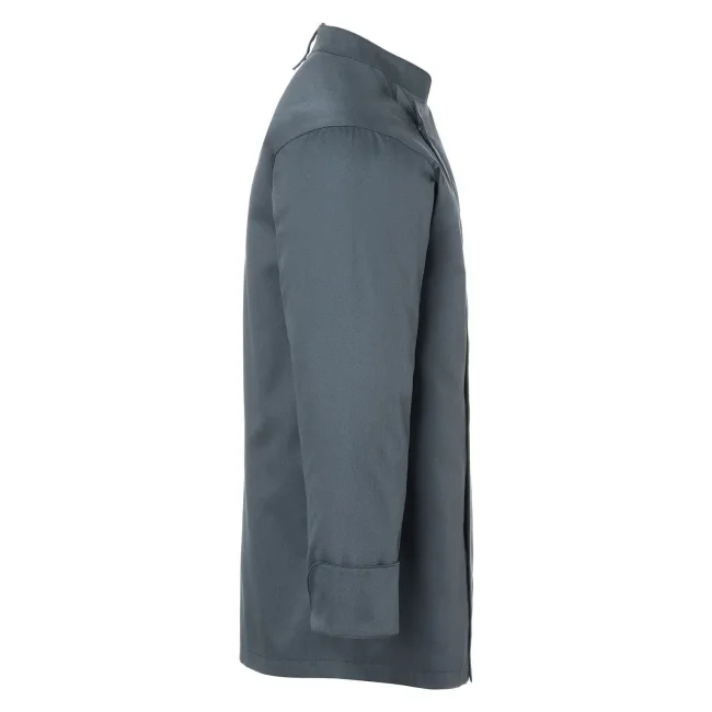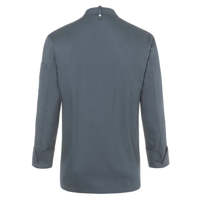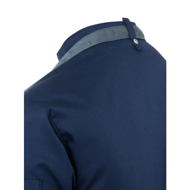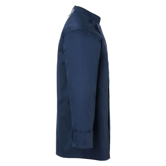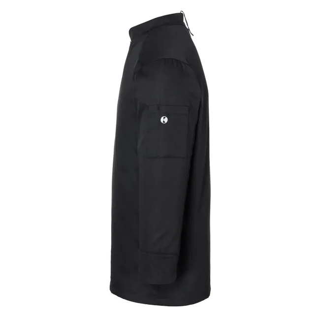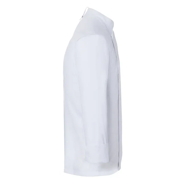 50% poliestere, 50% cotone. Giacca da Cuoco Noah, 150 g/m², altamente rifinito, irrestringibile, non stinge, facile da trattare. Giacca da chef elegante con inserto con bottoni a pressione in tessuto molto leggero, perfetta comodità per lavorare in ambienti caldi, ottima vestibilità grazie alla silhouette slanciata, bottoni a pressione per aprire e chiudere facilmente, pratica fascetta sul retro del colletto per fissare un grembiule con pettorina, polsini con spacco, tasca patch sulla manica sinistra con pratico scomparto per penne, adatto per lavaggio industriale a 95°C. Taglie: 46 - 64.