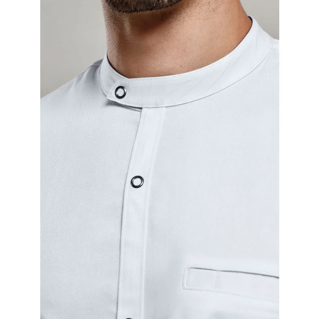 65% Poliestere riciclato, 35% Cotone. Giacca a maniche corte da chef in tessuto riciclato, cinque bottoni automatici lungo il canolo centrale, colletto alla coreana con singolo bottone automatico, colore tinta unita a contrasto all'interno del colletto, dettaglio della tasca lato cuore.
