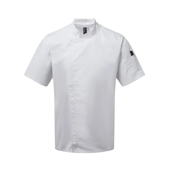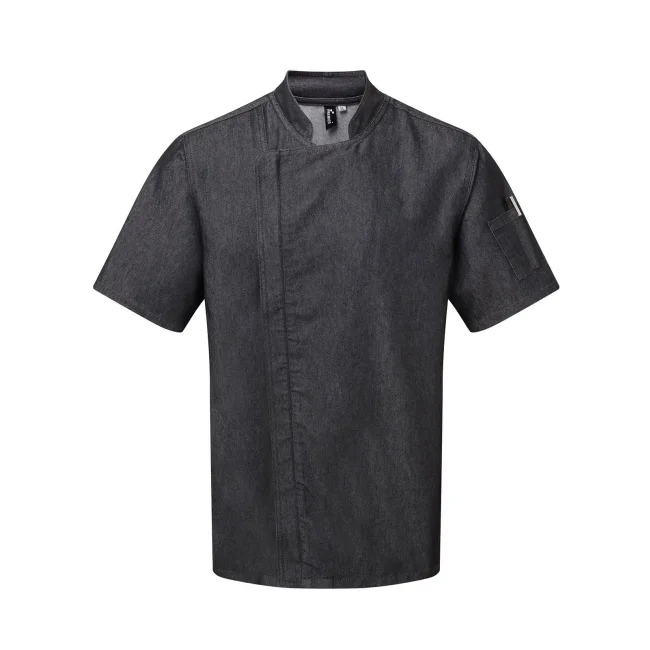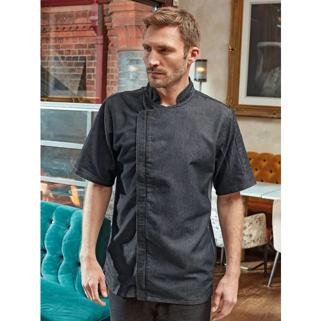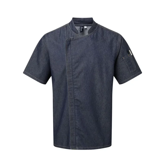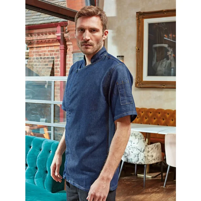 Bianco: 65% poliestere, 35% cotone twill, Denim: 60% cotone twill, 40% poliestere. Giacca da chef con chiusura a zip, colletto alla coreana, taschino doppio per penne sulla manica sinistra, tessuto a contrasto sotto le braccia.