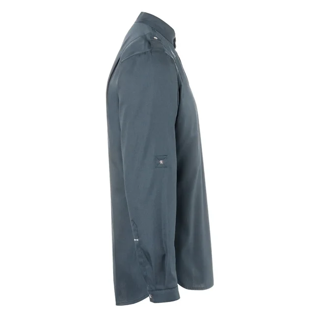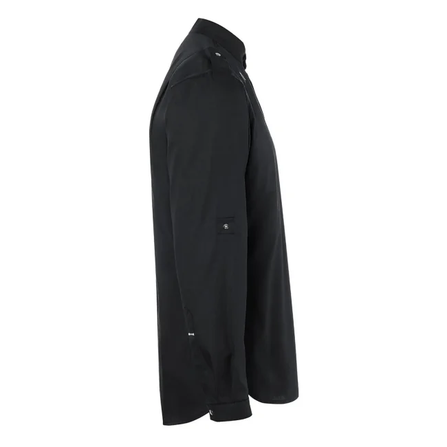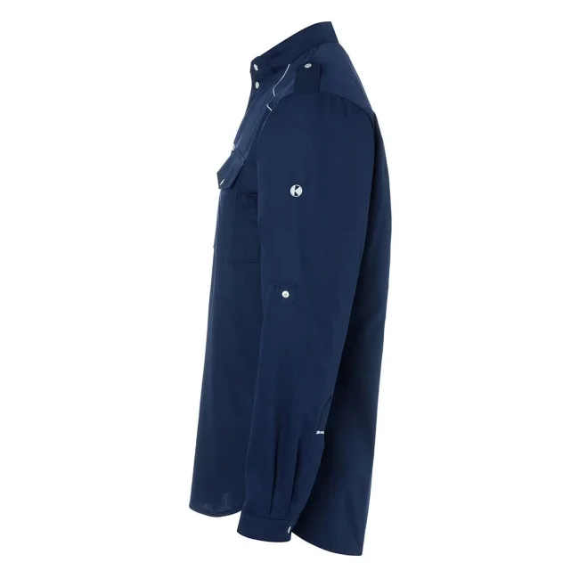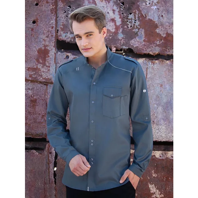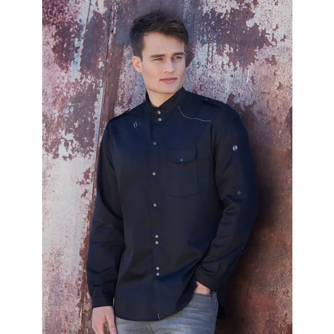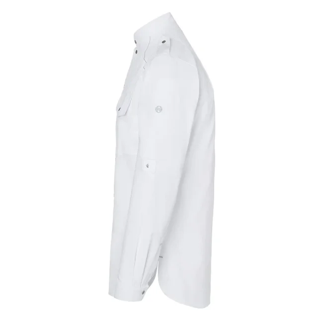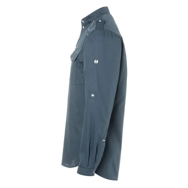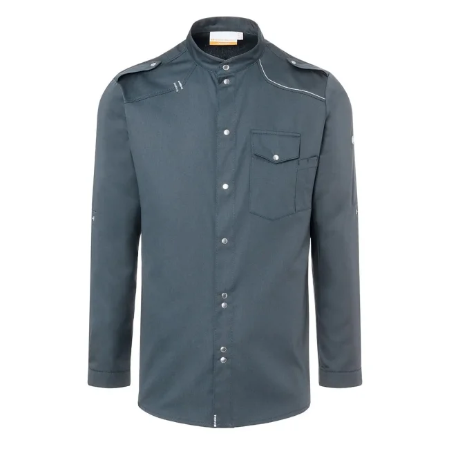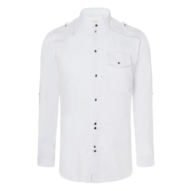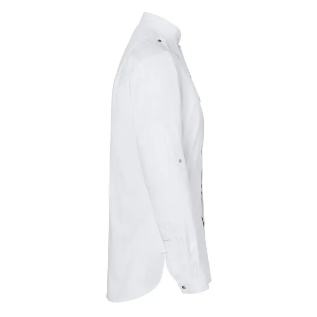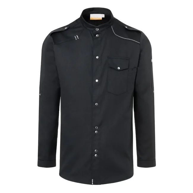 50% poliestere, 50% cotone. Camicia da Chef New-Identity, 150 g/m², tessuto altamente rifinito, irrestringibile, non stinge, facile da trattare. Camicia da chef con inserto con bottoni a pressione in tessuto molto leggero, perfetta e e comoda per lavorare negli ambienti caldi, maniche corte, vestibilità confortevole grazie alla silhouette slanciata, bottoni a pressione per aprire e chiudere facilmente, pratica fascetta sul retro del collo per fissare un grembiule con pettorina, tasca patch nella manica sinistra con un pratico scomparto per penne, adatto a lavaggio industriale a 95°C. Taglie 46 - 64.