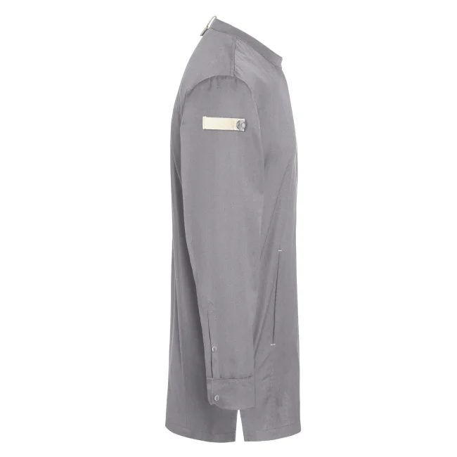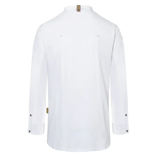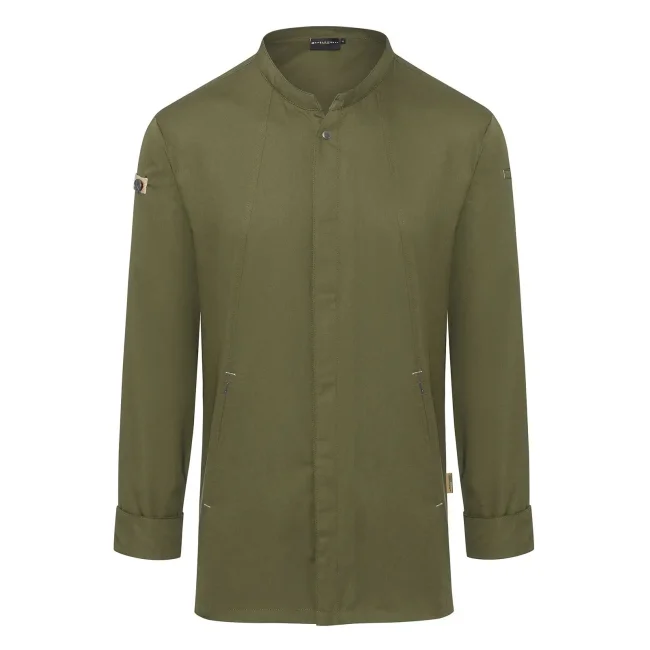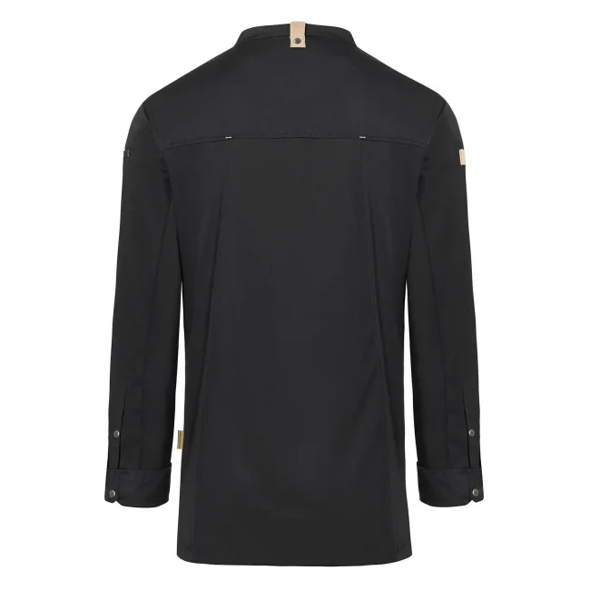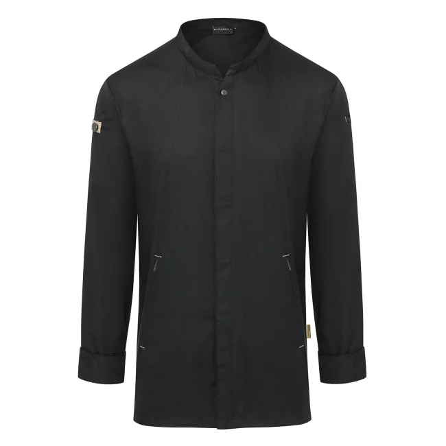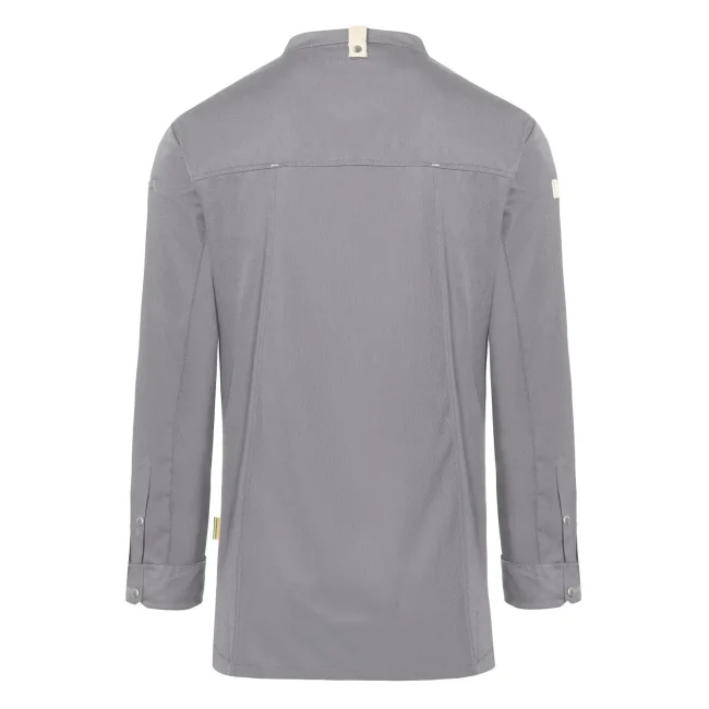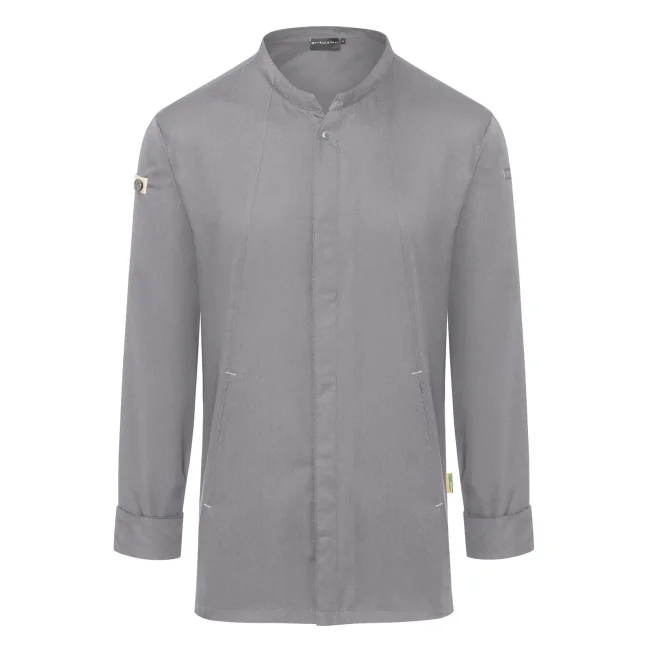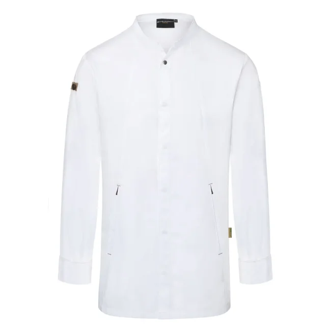 Lato anteriore: 65% cotone organico, 35% poliestere riciclato, Lato posteriore: 100% poliestere riciclato. Lato anteriore 150 g/m², Lato posteriore 150 g/m². Giacca da cuoco sostenibile, traspirante, con regolazione dell'umidità, maniche lunghe. Taglio moderno (leggermente aderente), inserto posteriore in Jersey Piqué per una maggior ventilazione e libertà di movimento, bottoni automatici, polsini con apertura. Lato anteriore con tasche con zip e tasca a filetto sulla manica sinistra, nastri a contrasto su maniche e collo. Lavabile a 60°C.