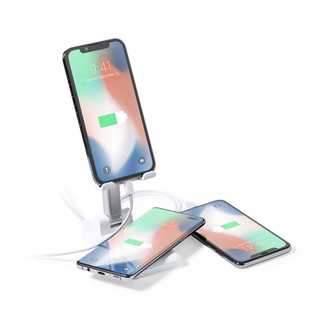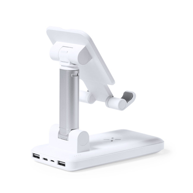 Supporto multifunzione pieghevole tutto in uno, realizzato in resistente ABS bianco. Regolabile in altezza e angolazione per una visione ottimale dello schermo dello smartphone. Caricatore wireless integrato da 10 W e batteria da 5.000 mAh, con ingresso/uscita Type-C, ingresso micro USB e due uscite USB. Compatibile con i dispositivi mobili a ricarica wireless, include un cavo di ricarica Type-C ed è confezionato in una scatola dal design accattivante.Le capacità indicate su tutti i nostri power bank sono reali e comprendono tutte batterie di grado A e non riciclate, con una durata di almeno 500 cicli di carica e conformi alla normativa CE. Inoltre, sono prodotti secondo gli standard RoHS e in conformità ai seguenti requisiti di sicurezzaSistema di protezione da sovraccarico del power bank. Sistema di protezione dalla scarica completa per una maggiore durata del power bank. Sistema di blocco per evitare cortocircuiti. Sistema di trasferimento di carica costante, in base alla capacità del dispositivo di destinazione.