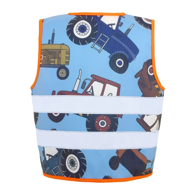 100% poliestere. Gilet ad alta visibilità per bambini con disegni di mezzi da cantiere, alta visibilità grazie al tessuto leggero a fantasia con rivestimento riflettente e strisce riflettenti, chiusura con pratica cerniera. certificato secondo la norma EN 17353