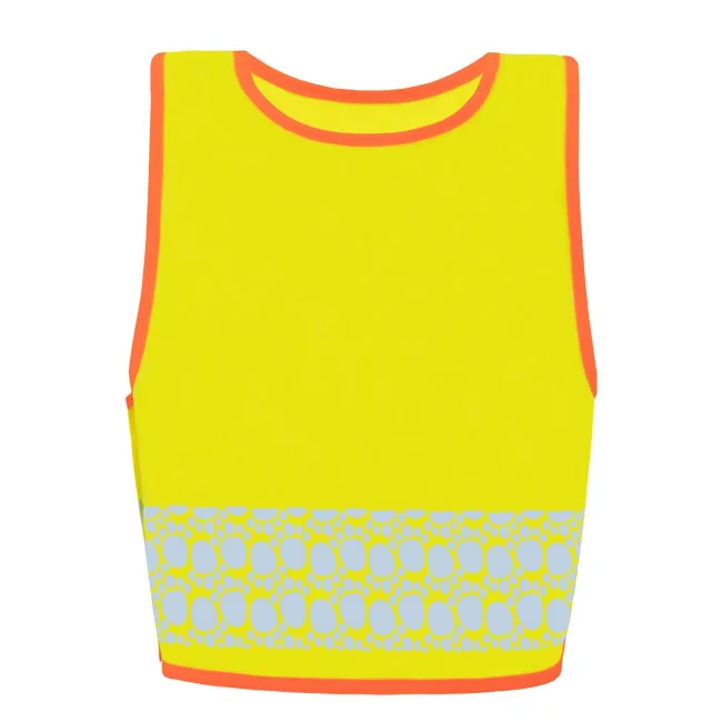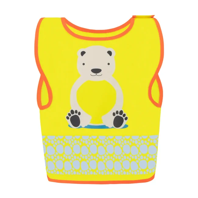 100% poliestere. Gilet ad alta visibilità per bambini con simpatici motivi animali, l'area della pancia degli animali offre una superficie facile da stampare e le strisce riflettenti sono segmentate a forma di tracce di animali, pratica chiusura in velcro sul lato e sulla spalla, tessuto leggero, certificato secondo EN 17353.