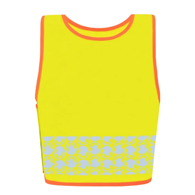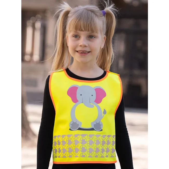 100% poliestere. Gilet ad alta visibilità per bambini con simpatici motivi animali, l'area della pancia degli animali offre una superficie facile da stampare e le strisce riflettenti sono segmentate a forma di tracce di animali, pratica chiusura in velcro sul lato e sulla spalla, tessuto leggero, certificato secondo EN 17353.