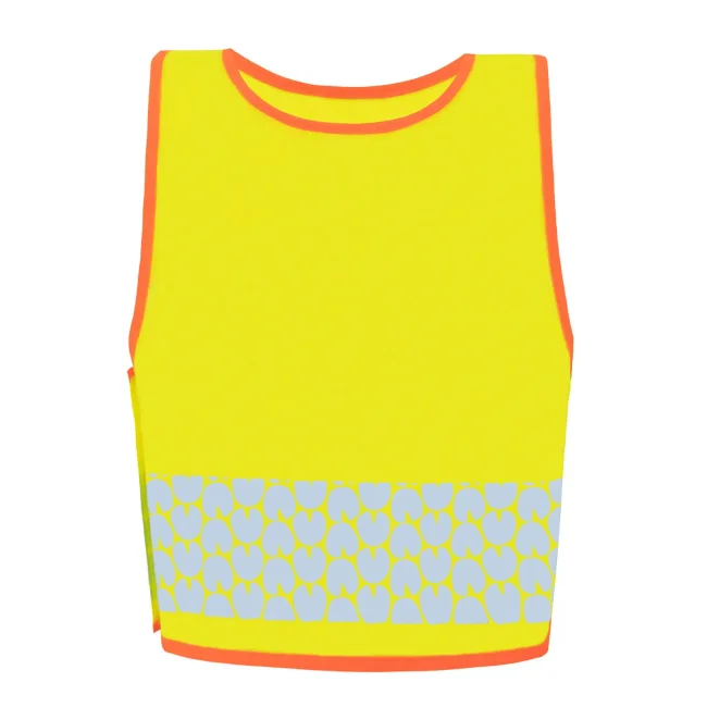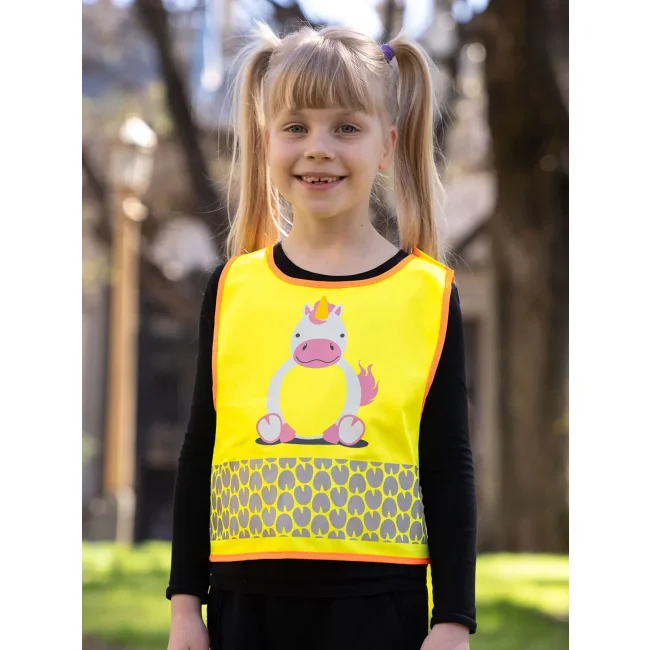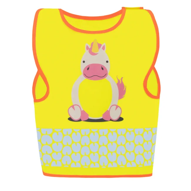 100% poliestere. Gilet ad alta visibilità per bambini con simpatici motivi animali, l'area della pancia degli animali offre una superficie facile da stampare e le strisce riflettenti sono segmentate a forma di tracce di animali, pratica chiusura in velcro sul lato e sulla spalla, tessuto leggero, certificato secondo EN 17353.