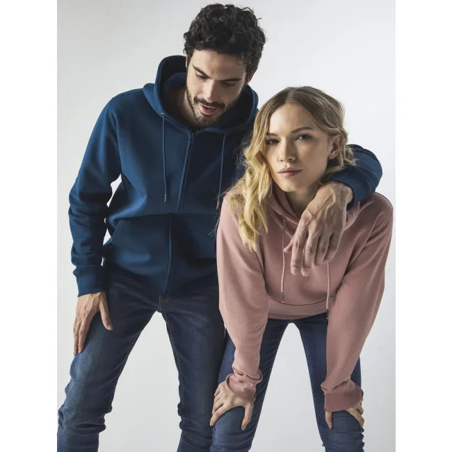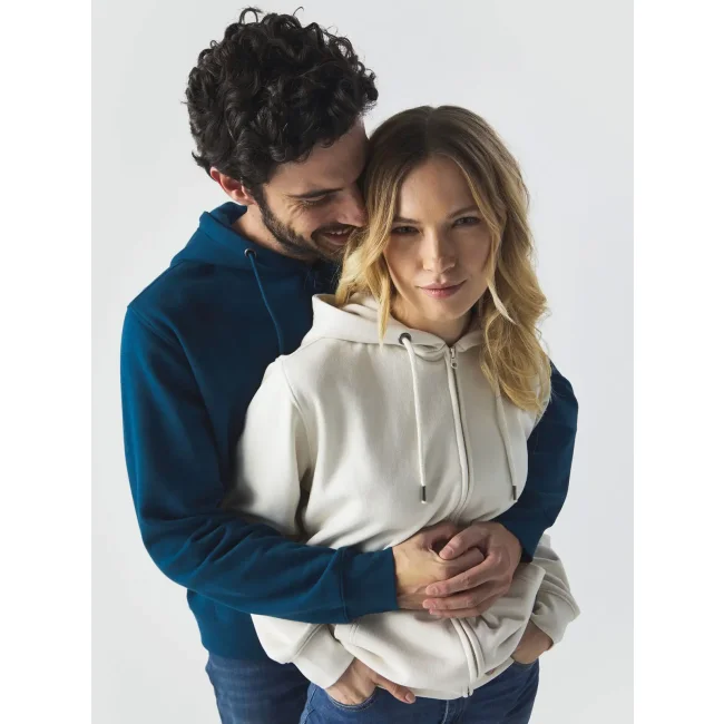 80% cotone organico, 20% poliestere riclicato. Felpa con cappuccio a doppio strato, genderless, morbido tessuto ecosostenibile trattato ad enzimi, cerniera tono su tono coperta, occhielli in metallo, cordini con punta in metallo, maniche set-in, tasca a marsupio, struttura con cuciture laterali, fascia in vita e polsini in costina. Felpata internamente in poliestere ed esterno 100% cotone per una migliore stampabilità. Etichetta taglia tessuta al collo ed etichetta laterale strappabile con logo, composizione e istruzioni di lavaggio.