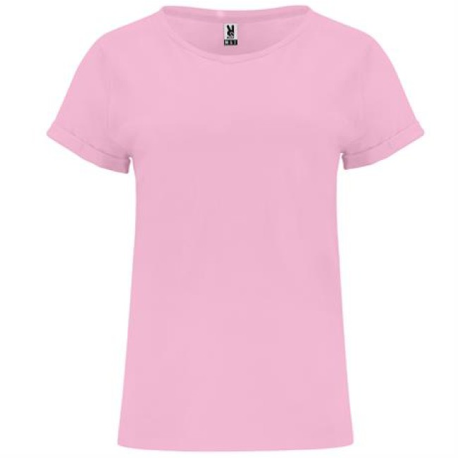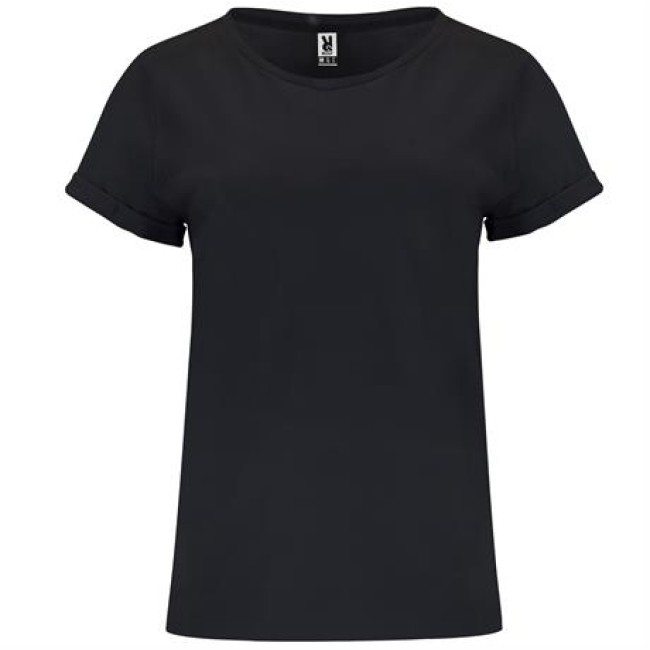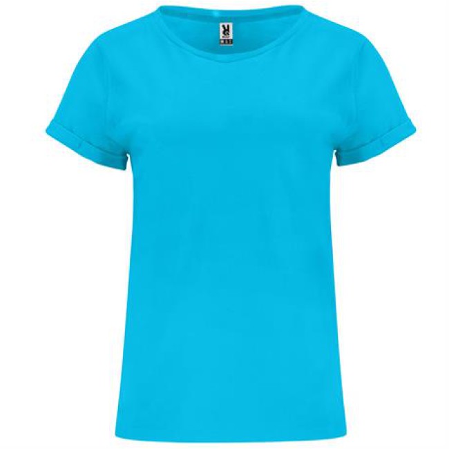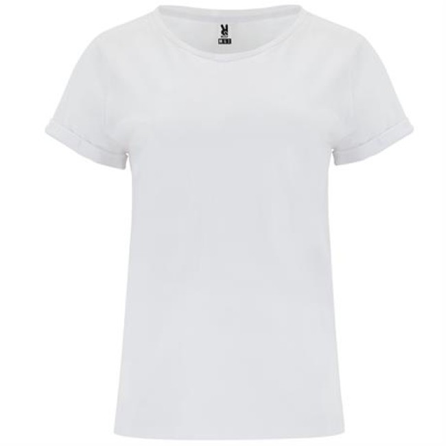 T-shirt manica corta da donna. Girocollo nello stesso tessuto e copri cuciture interne in tinta. Risvolto nella manica rinforzato con quattro punti.