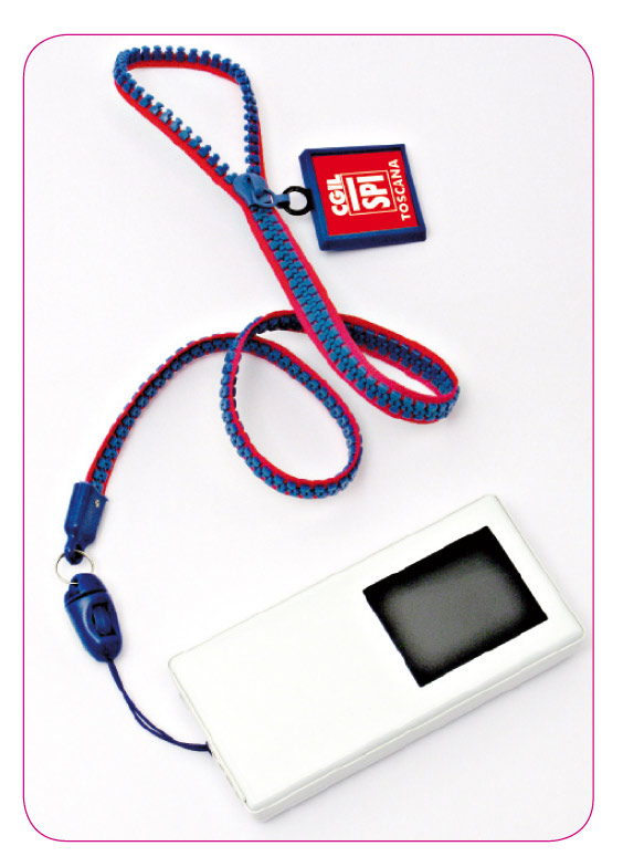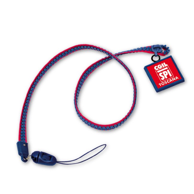 Cinghietto da collo a cerniera con zip, completo di laccio porta cellulare/badge e particolare quadrato di plastica gommata. Confezione in polybag.