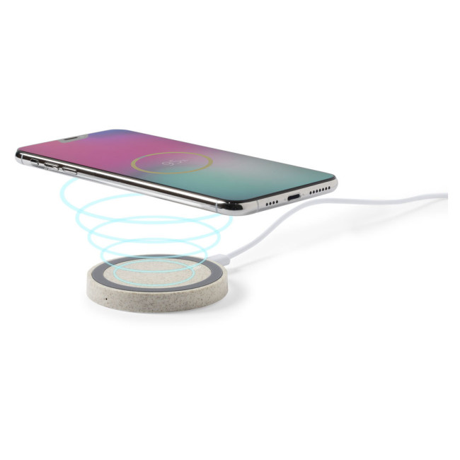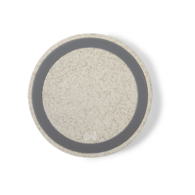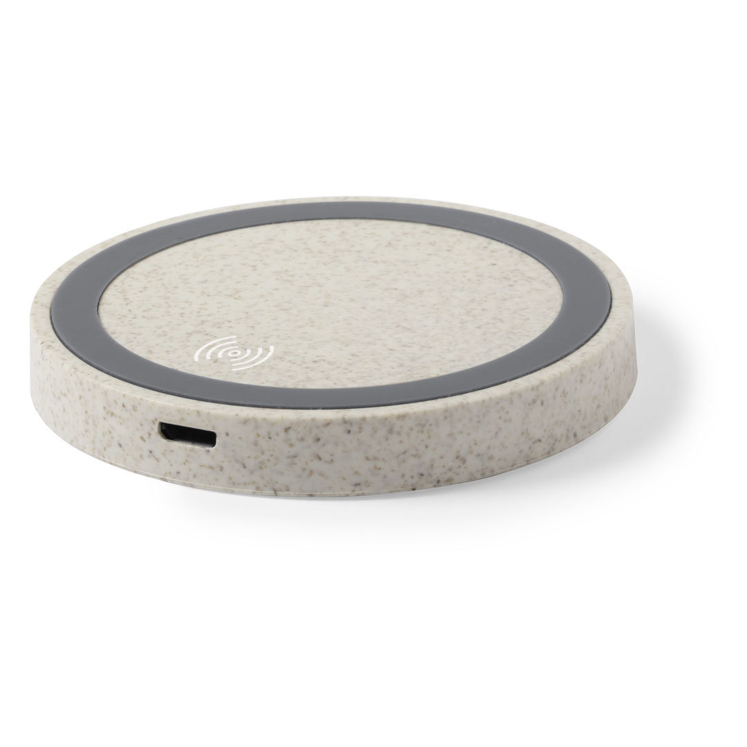 Caricabatterie wireless circolare Nature line. Involucro di canna da grano, al fine di promuovere l'uso di materie prime naturali e ridurre le emissioni inquinanti. Con base antiscivolo e indicatore LED dello stato di carica. Compatibile con smartphone con tecnologia di ricarica wireless e presentato in un'attraente scatola ecologica.