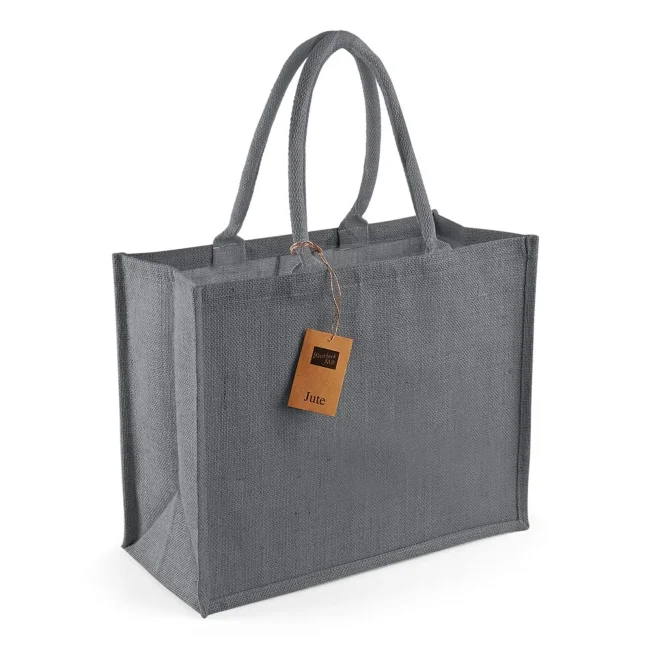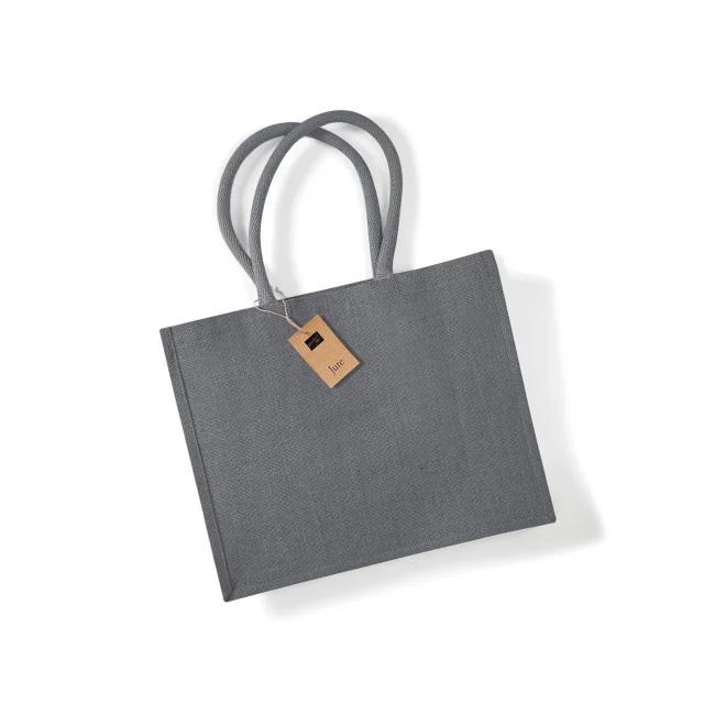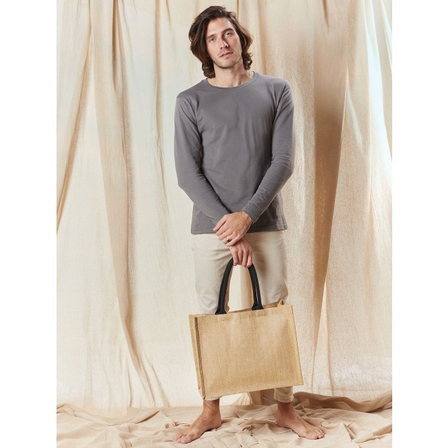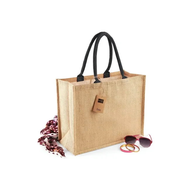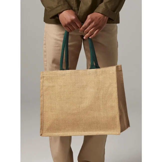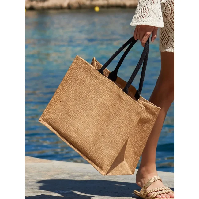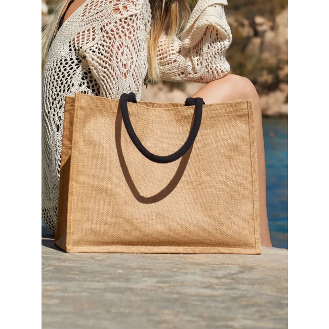 100% Juta laminata. Shopper multiuso. Etichetta removibile. Lunghezza manico: 55 cm, dimensioni: 33 x 42 x 19 cm, capacita': 21 litri, area stampabile: 34 x 24 cm.