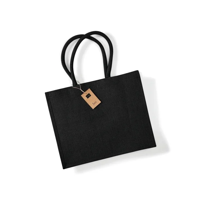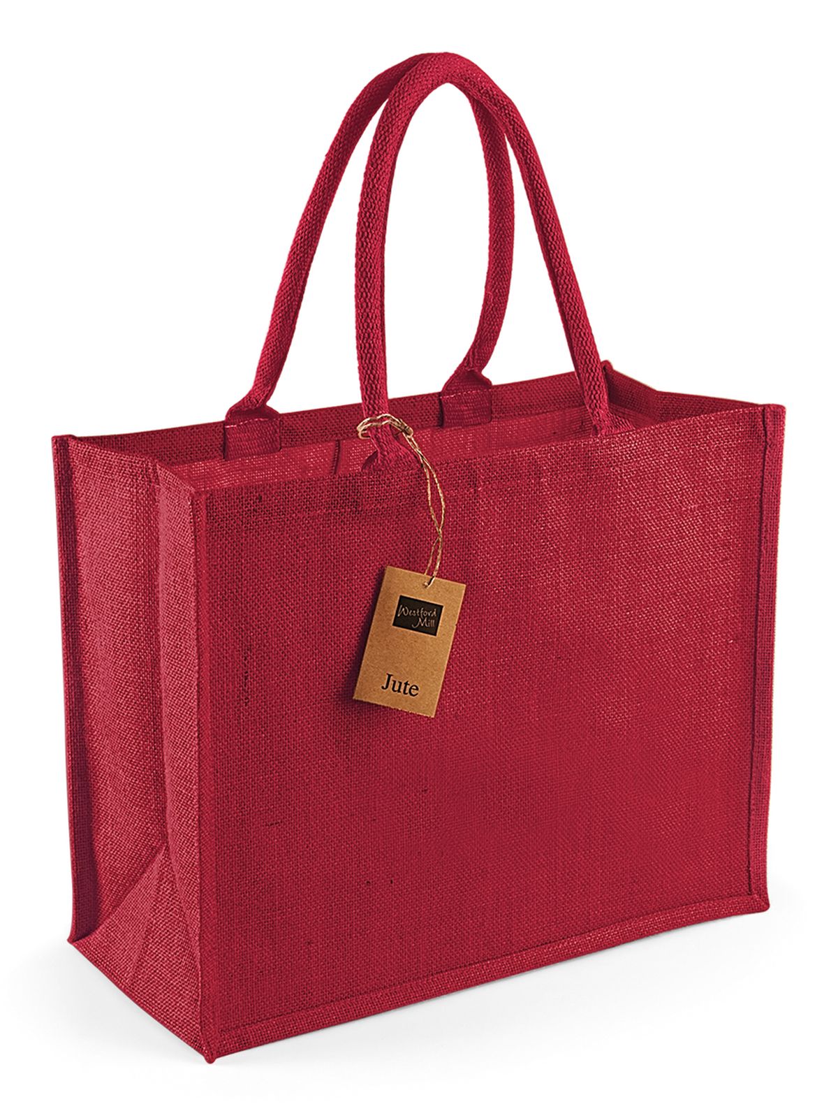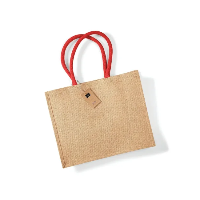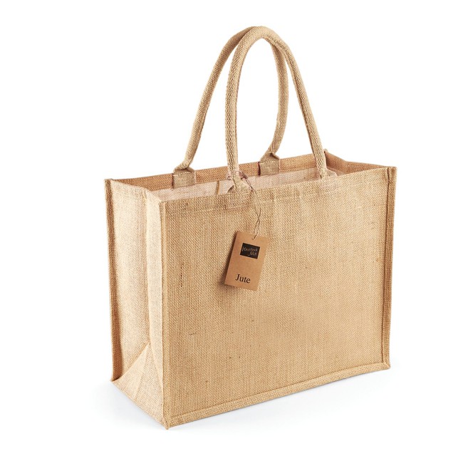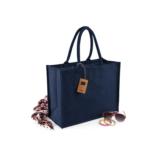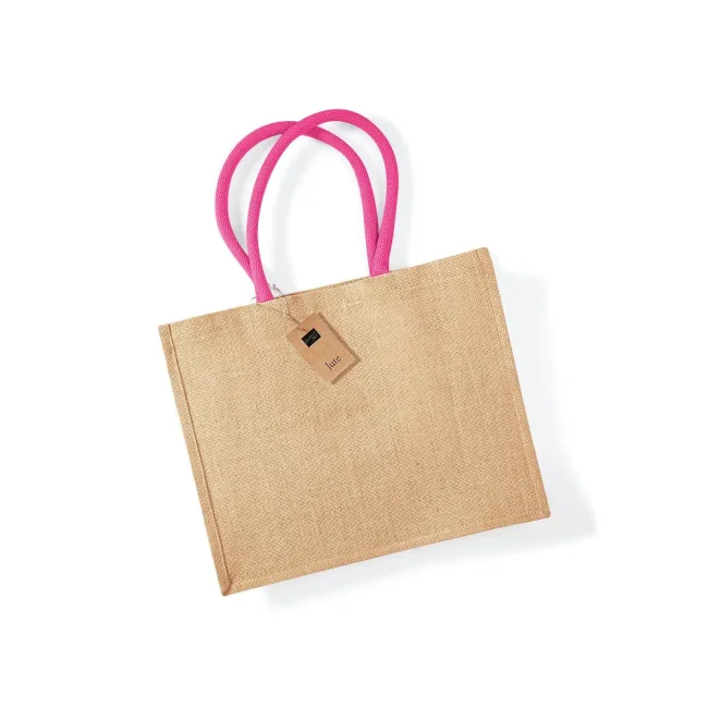 100% Juta laminata. Shopper multiuso. Etichetta removibile. Lunghezza manico: 55 cm, dimensioni: 33 x 42 x 19 cm, capacita': 21 litri, area stampabile: 34 x 24 cm.