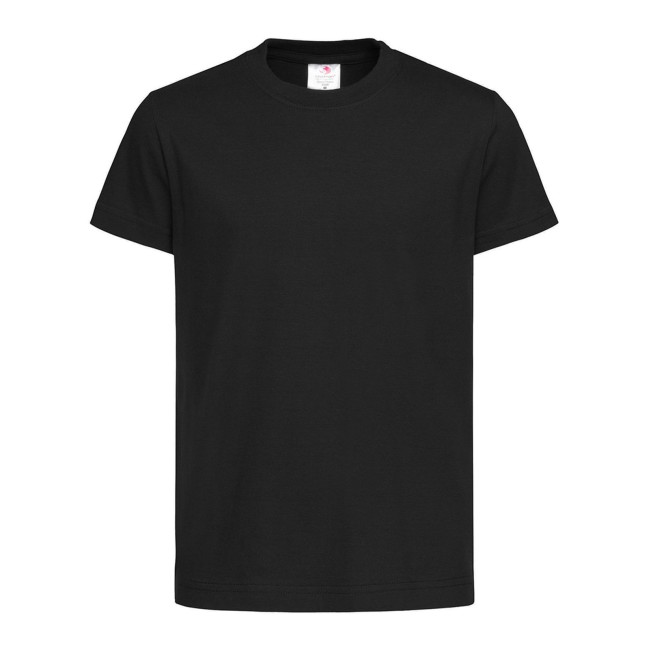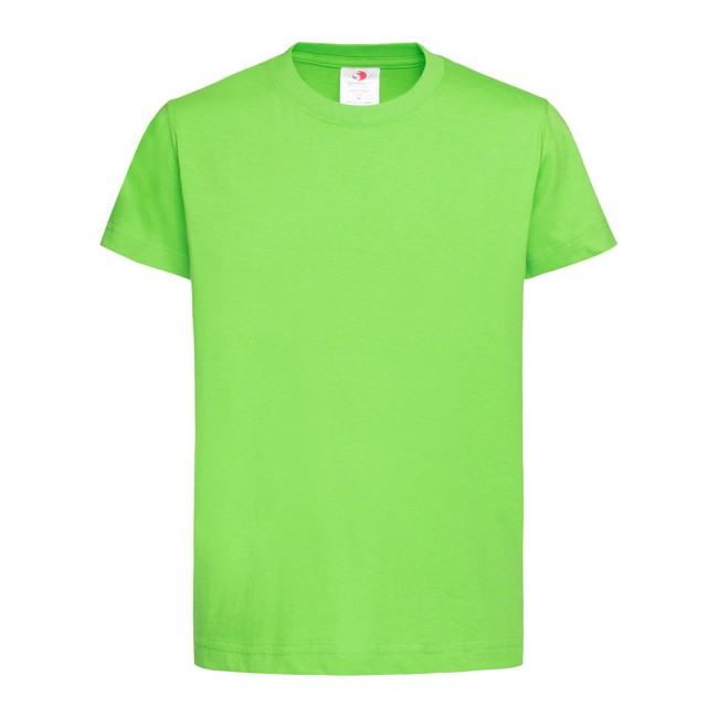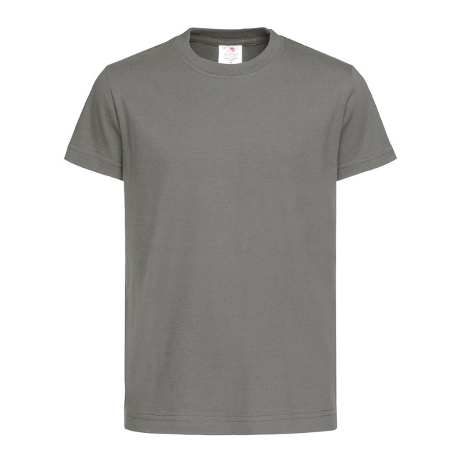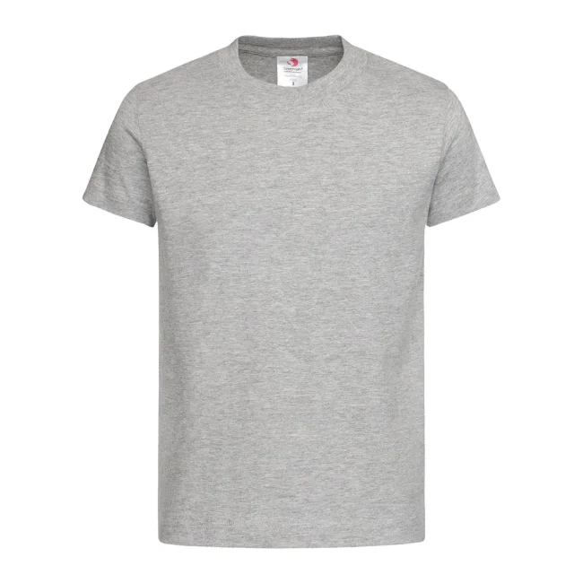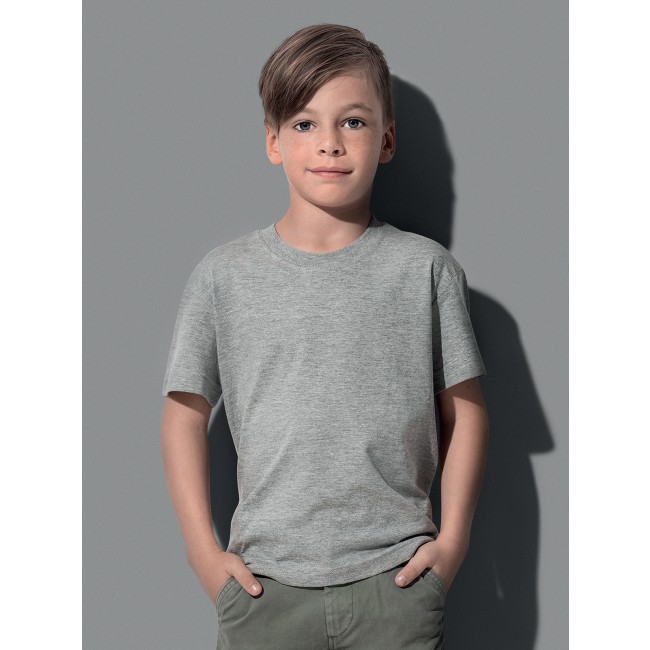 100% cotone certificato organico OCS. T-shirt girocollo da bambino con maniche corte, struttura tubolare, cuciture rinforzate sulle spalle. Col. GYH 85% cot. 15% visc.