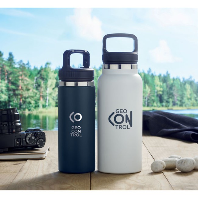 Bottiglia isolata sottovuoto in acciaio inox a doppio strato con gancio sul coperchio. Capacità: 970 ml.