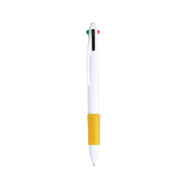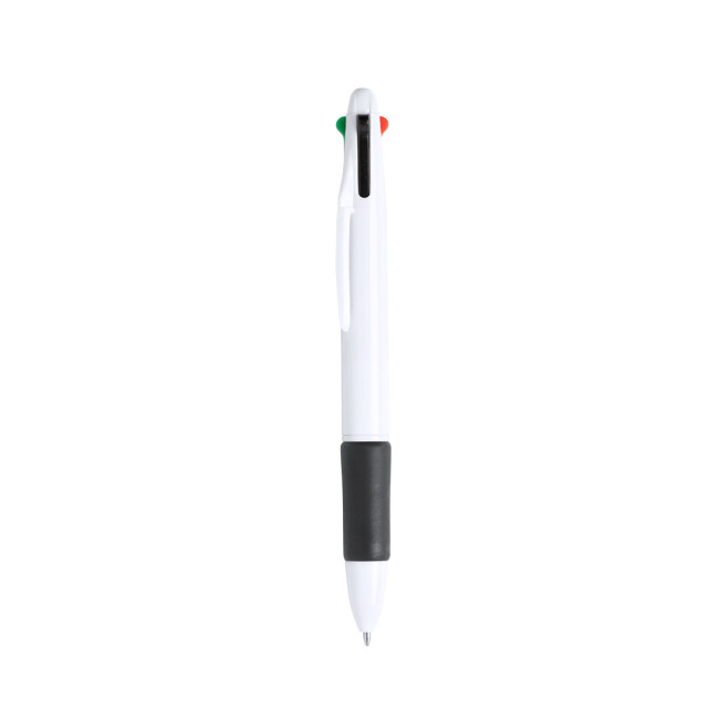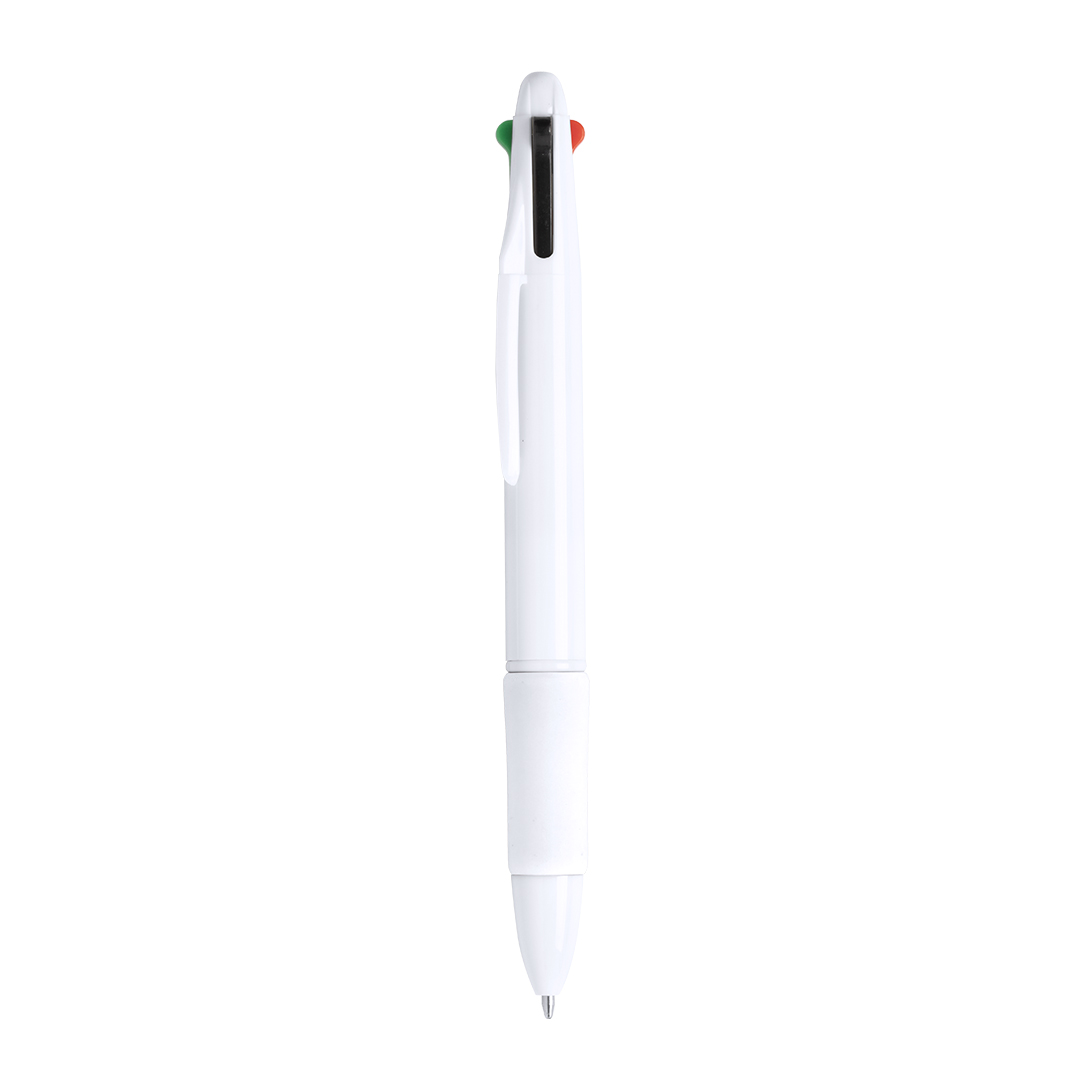 Penna 4 in 1 con meccanismo rettrattile, dal design classico e fusto liscio bianco con finitura piena. Impugnatura morbida abbinata in colori vivaci. 4 cartucce, con inchiostri blu, nero, rosso e verde.