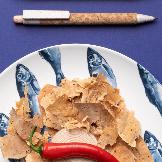 Penna della linea natura con fusto in sughero naturale. Clip, punta e pulsante in fibra di grano, per favorire l'utilizzo di materie prime naturali e ridurre le emissioni inquinanti. Con clip appositamente studiata per la tampografia. Con meccanismo a pulsante e inchiostro blu.