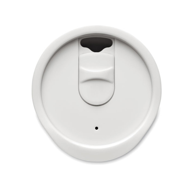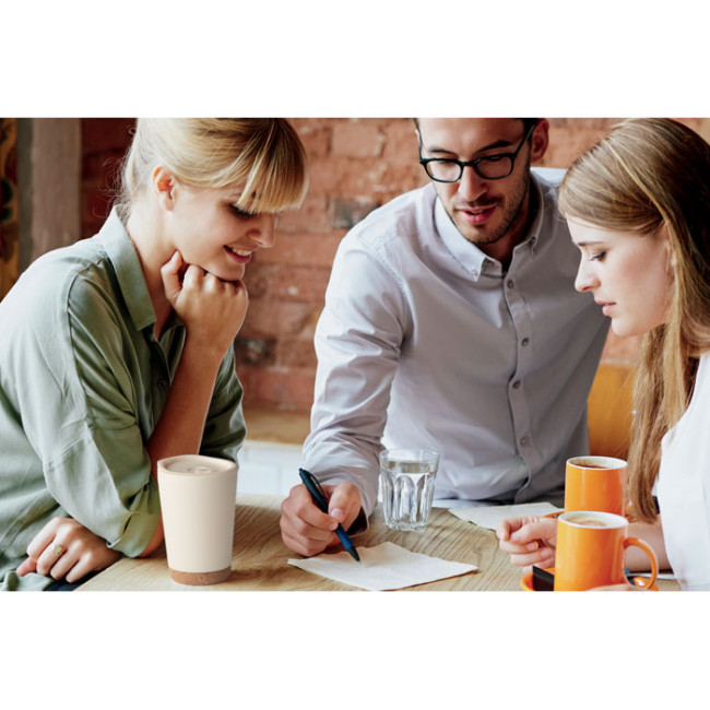 Bicchiere a doppio strato e in PP con base in sughero e coperchio con chiusura a scorrimento in PS. Capacità: 300 ml.
