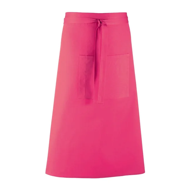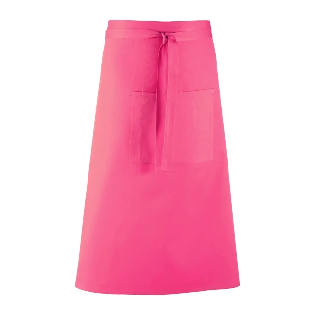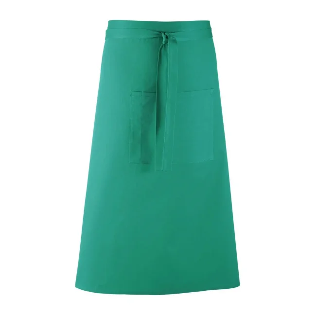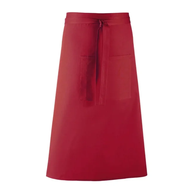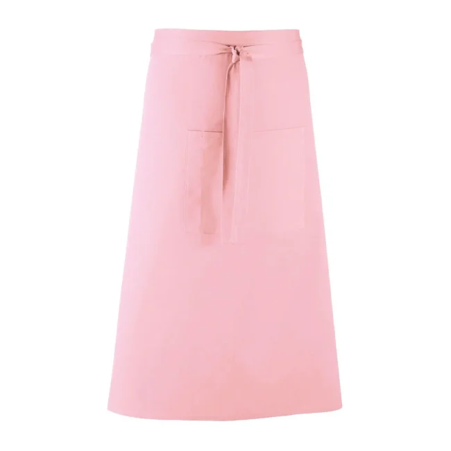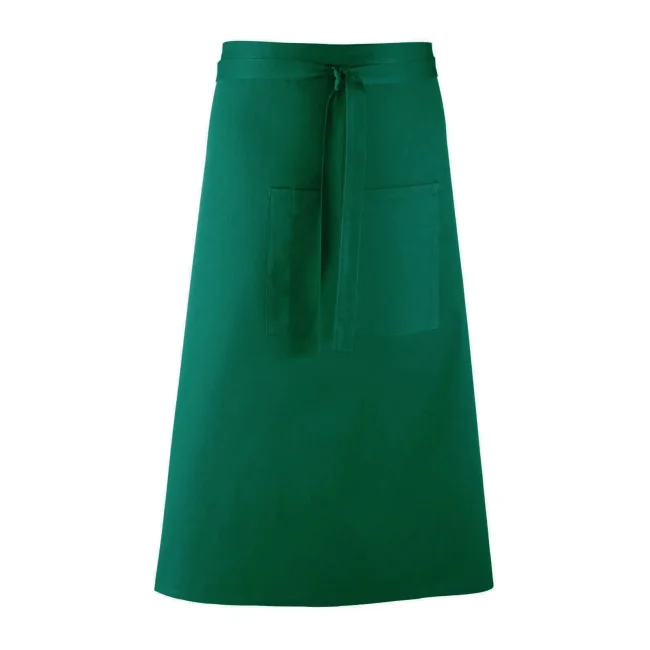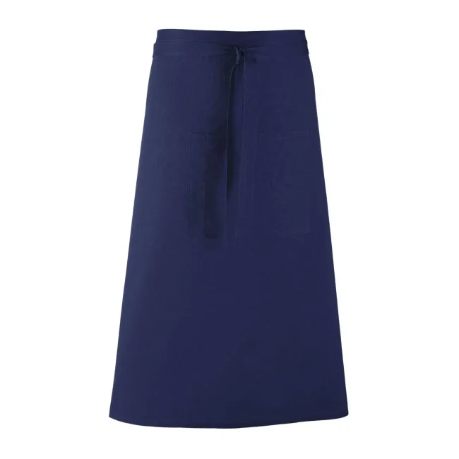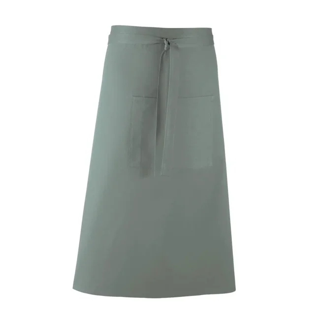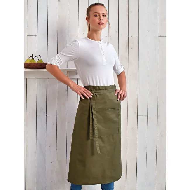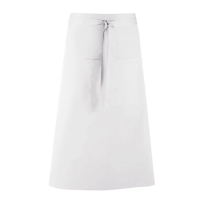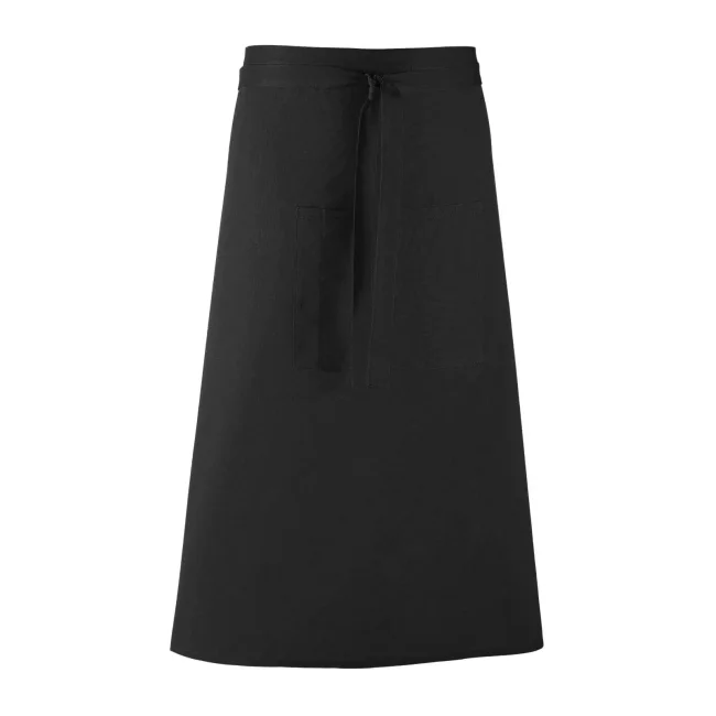 65% poliestere, 35% cotone twill. Grembiule lungo in stile bar con grande tasca frontale e taschino per penna, allacciatura posteriore con lacci da 90 cm. Lavabile a 60° in lavatrice domestica, e 85° in lavatrice industriale.