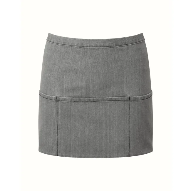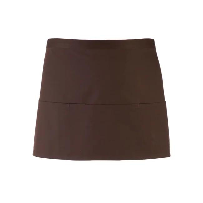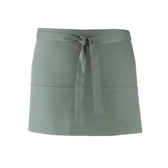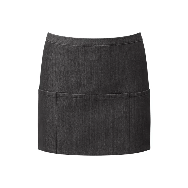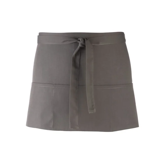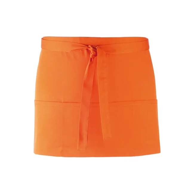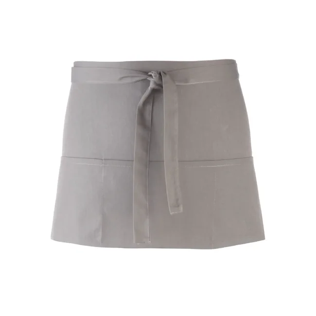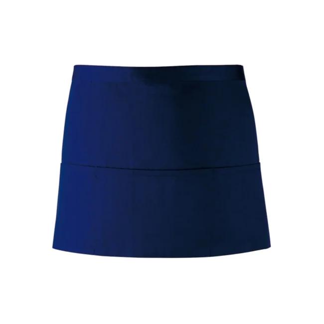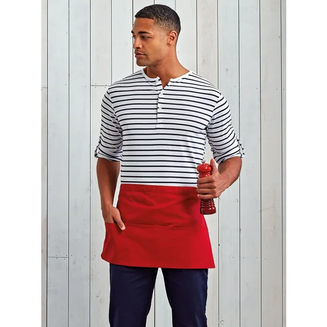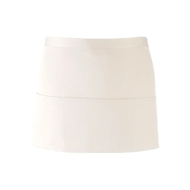 65% poliestere, 35% cotone twill. Grembiule corto in stile bar con tre tasche frontali, allacciatura posteriore con lacci da 90 cm. Lavabile a 60° in lavatrice domestica, e 85° in lavatrice industriale.